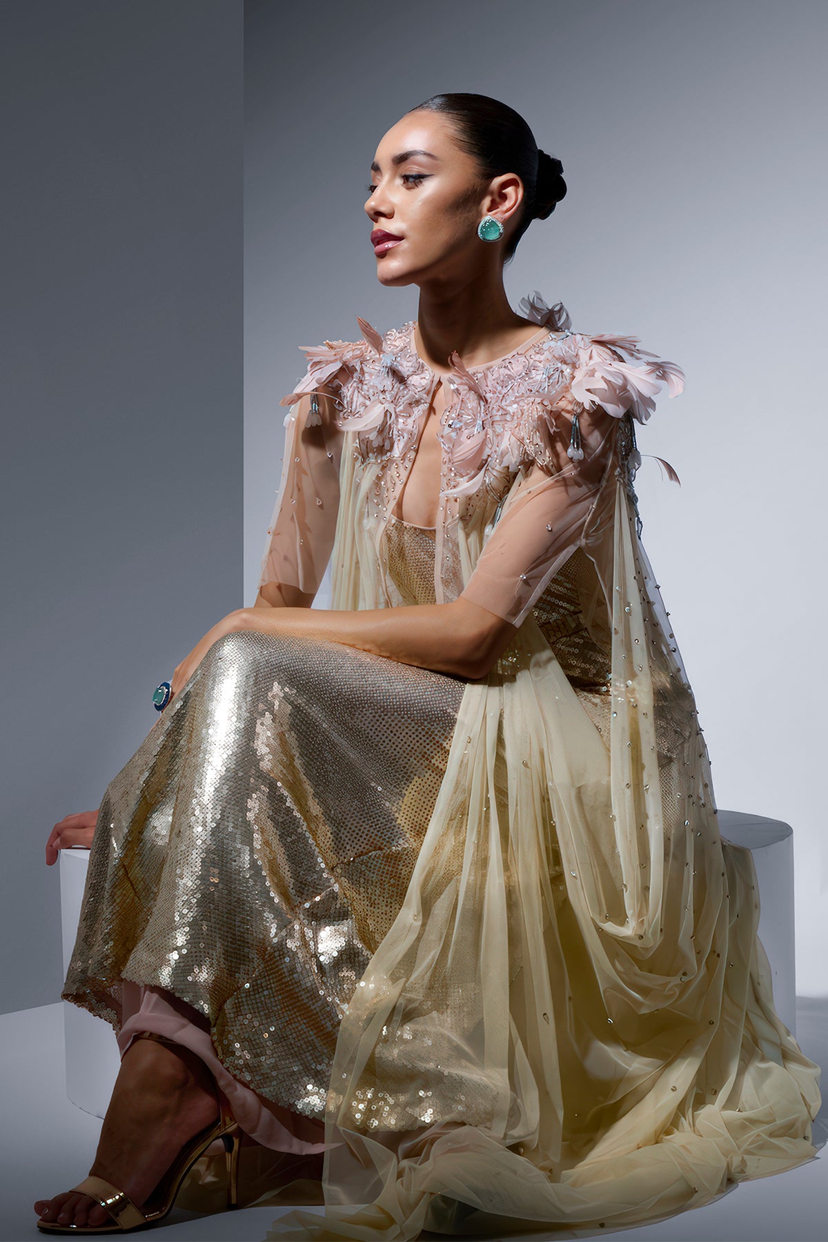 Mint soft net sequin dress. Featuring a cape with an enchanting array of sequins that gracefully reduce in density as they flow down the cape.