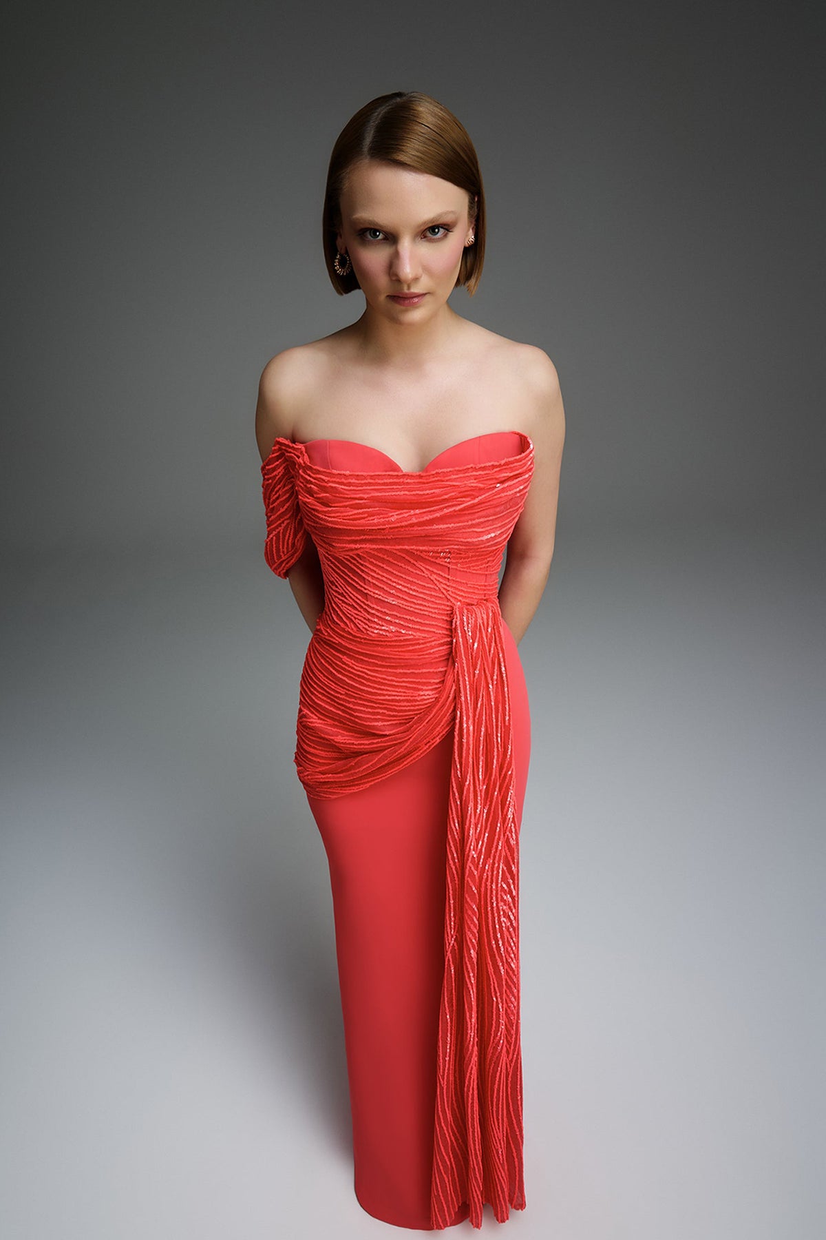 Coral satin long dress. Featuring an off-the-shoulder with a fitted column silhouette.