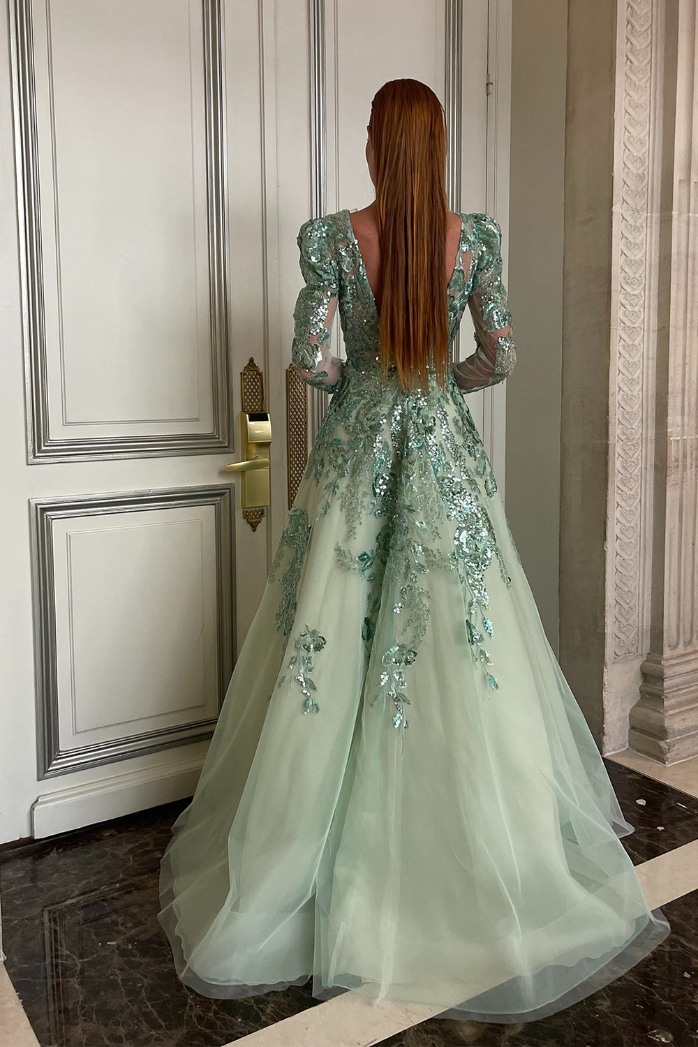 Embroidered Tulle Long-Sleeved Off-The-Shoulder Dress