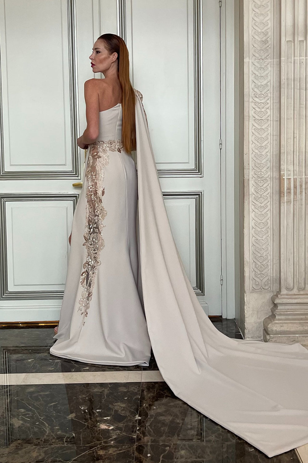 Taffeta Off-The-Shoulder Gown with Puffy Sleeves