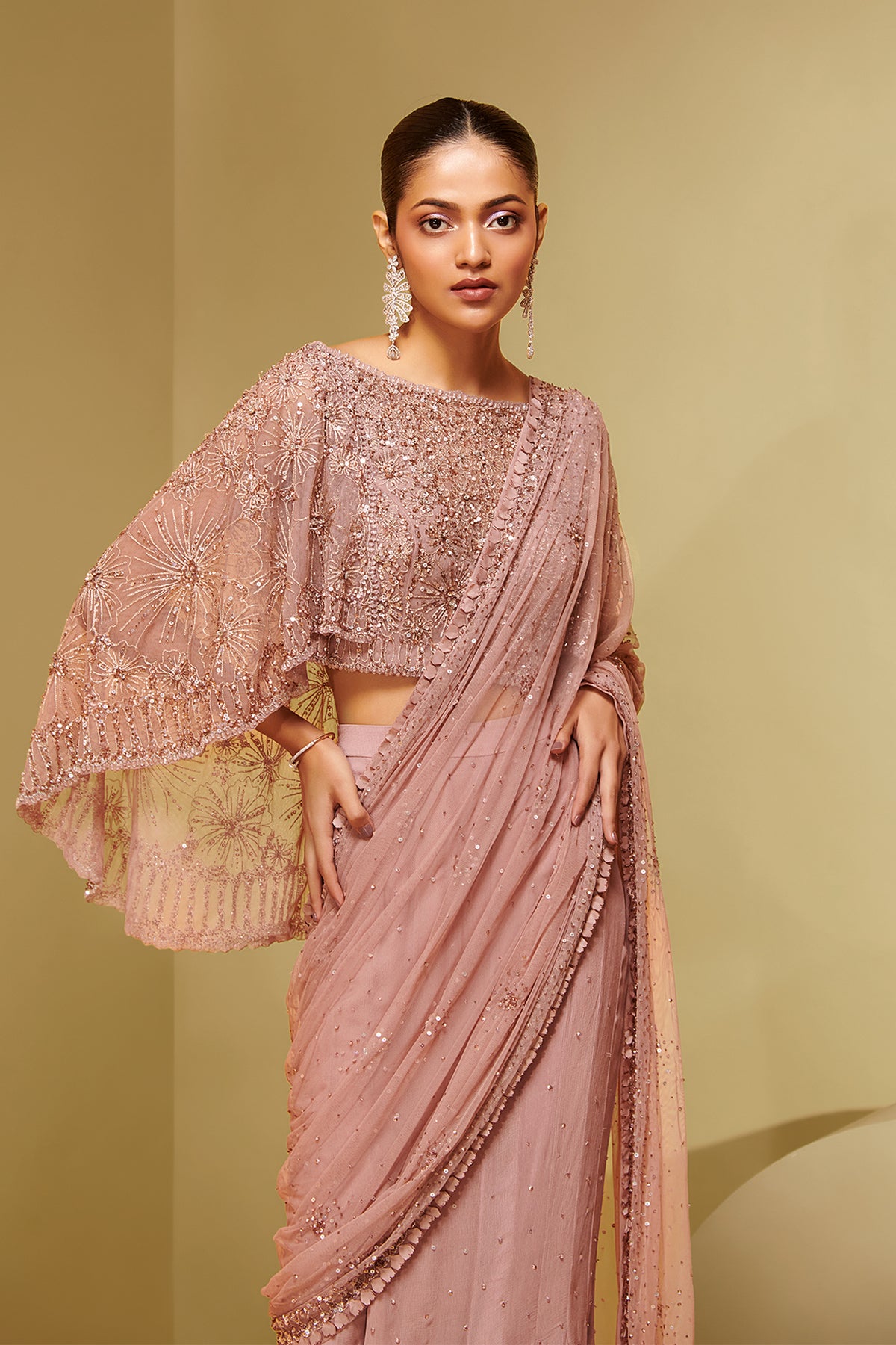 Old rose mesh and georgette two-pieces. Featuring stunning laser-cut embroidery along the border with intricate patterns that shimmer. Complemented with mesh adorned with playful dots and daisy laser-cut embroidery.