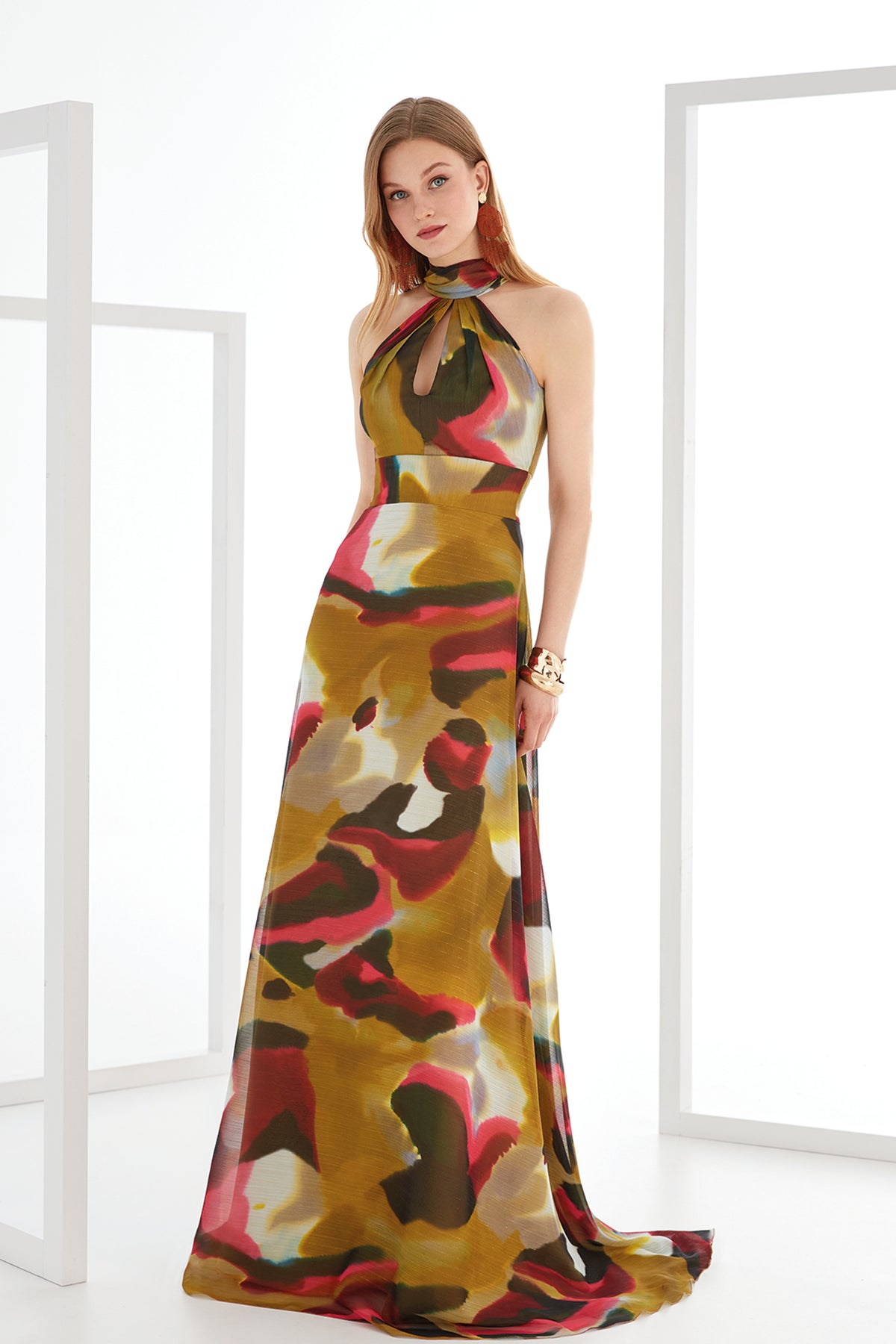 Multicolor halter-neck long dress. Featuring a crafted printed georgette structured waist enhances the figure and leads into a flowing lightweight full-circle skirt.
