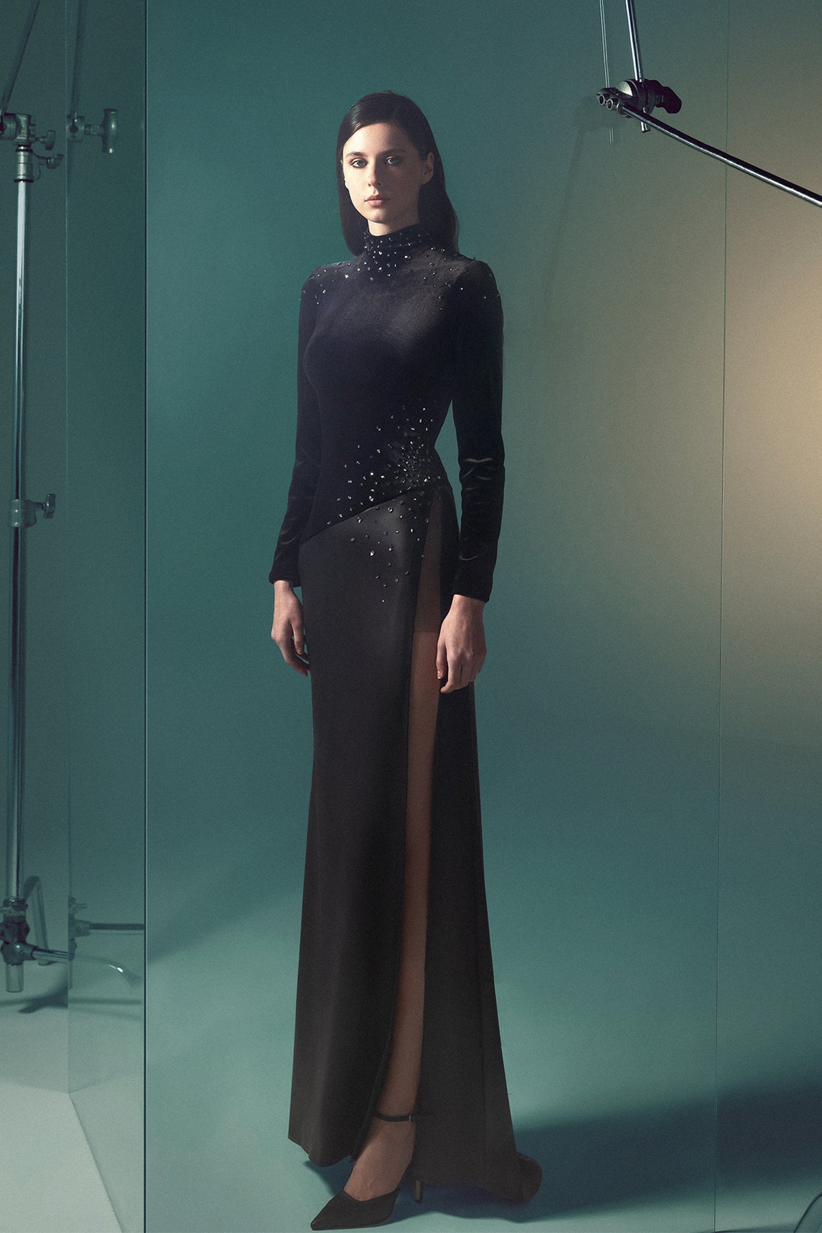 Black A-line full-length dress. Featuring fitted sleeves that extend to the wrists, a high neckline with embroidery. Complemented with high slit on one side, starting from the thigh and extending to the hem.