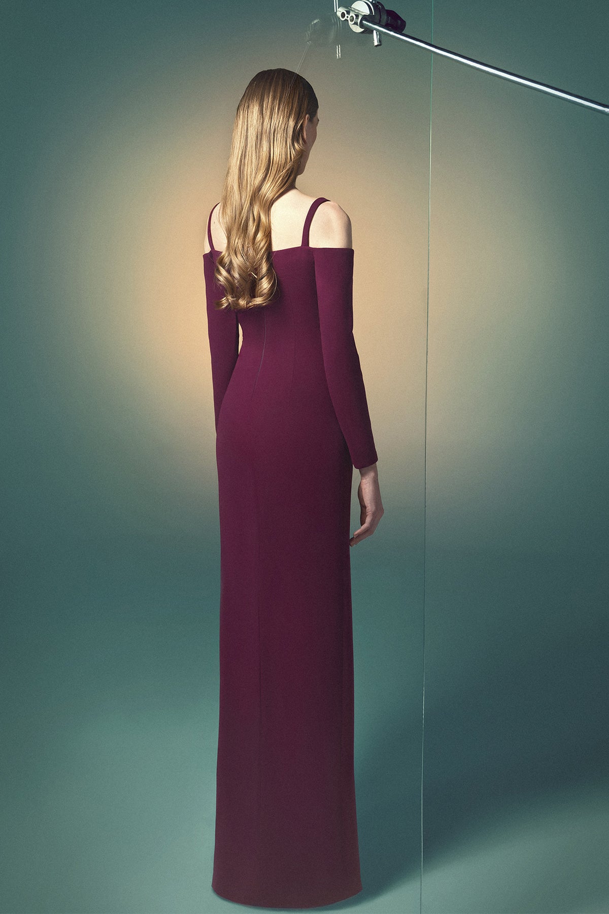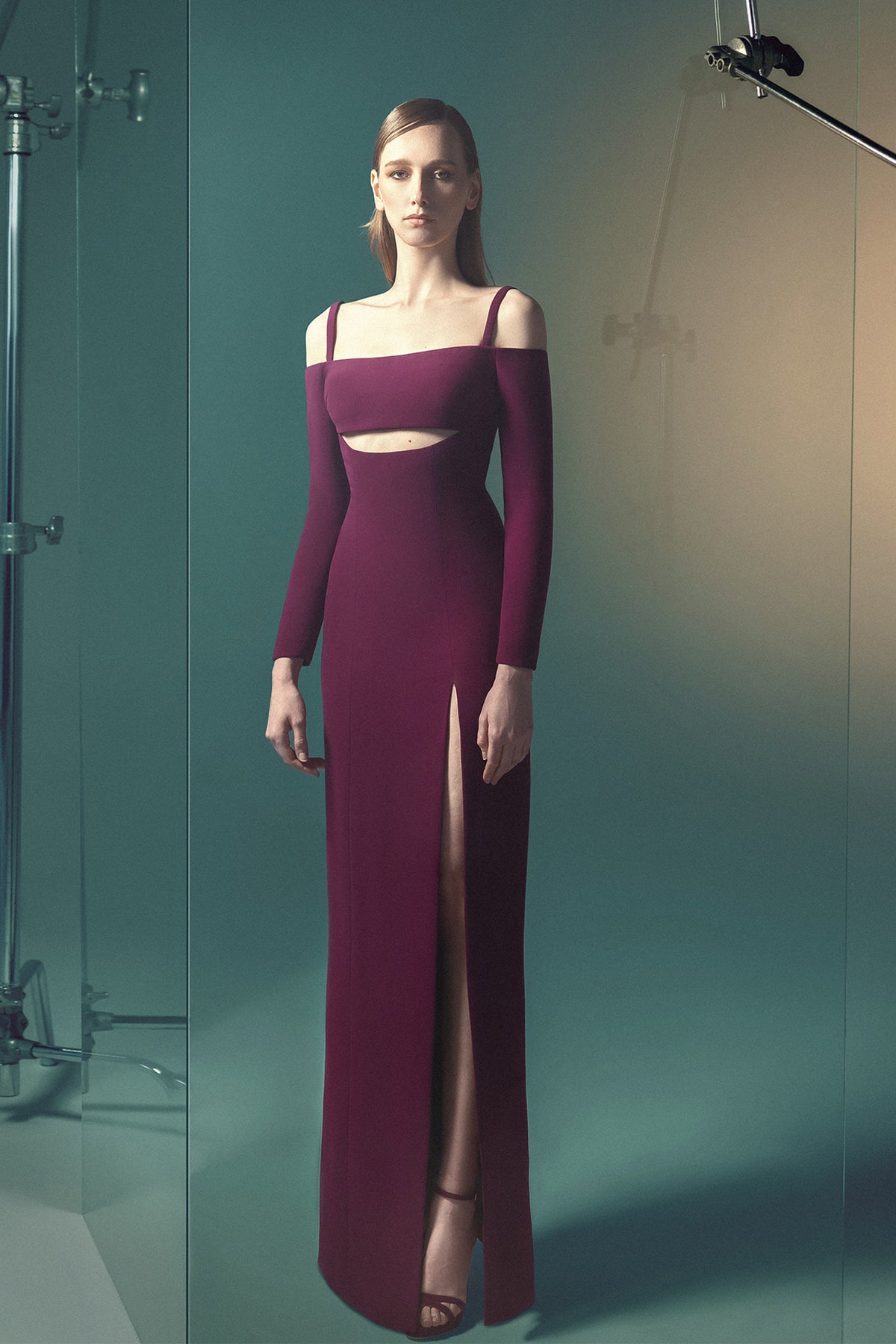 Burgundy column crepe dress. Featuring an off-the-shoulder neckline with delicate straps, long sleeves extend to the wrists, fitted to create a streamlined appearance. A high slit on one side starts at mid-thigh and extends down to the hem.