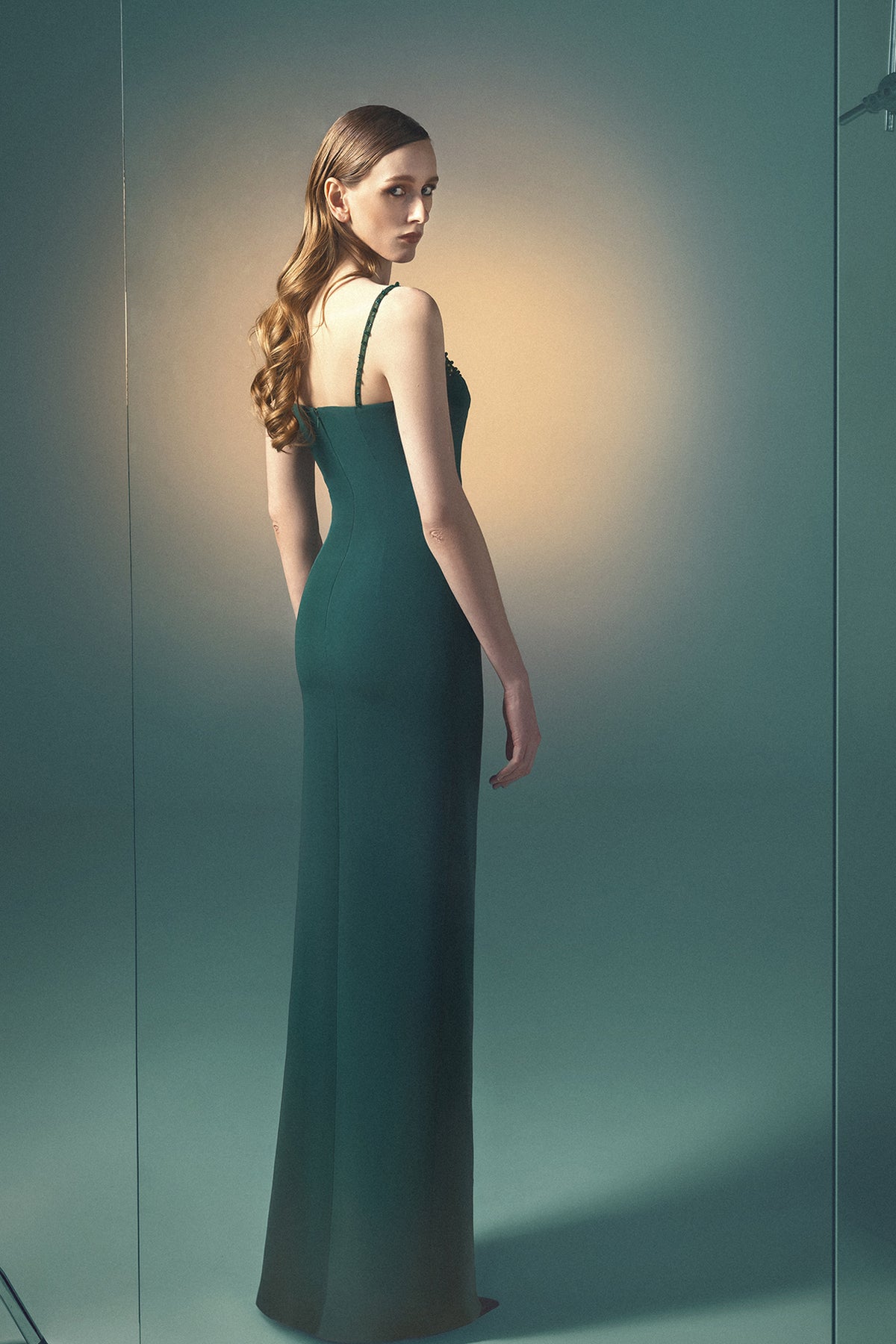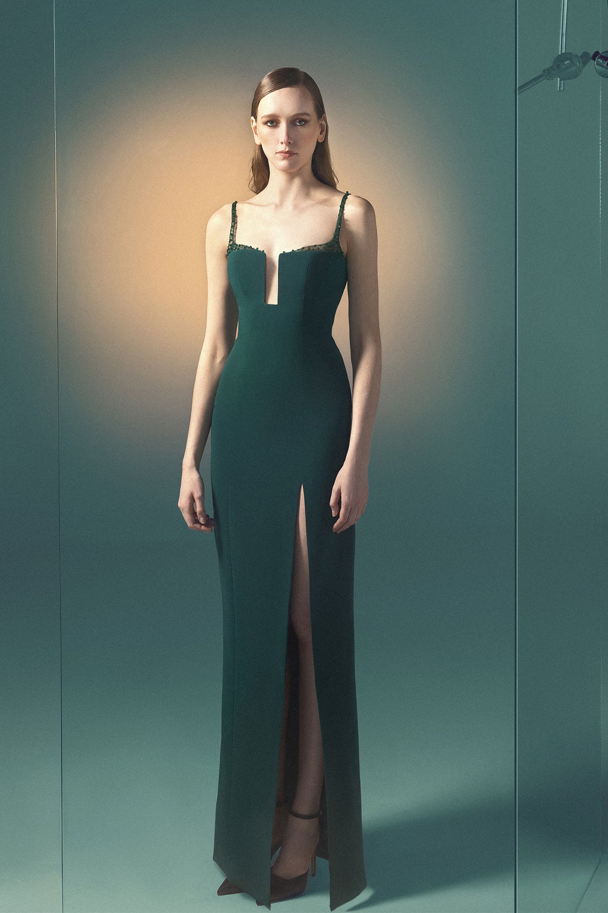 Green floor-length dress. Featuring a sleek, fitted silhouette, the body runs from the top to the hem, with thin straps that delicately rest on the shoulders. Complemented with a structured, square neckline with a prominent, central cutout that extends downward from the neckline, creating a bold and modern statement.