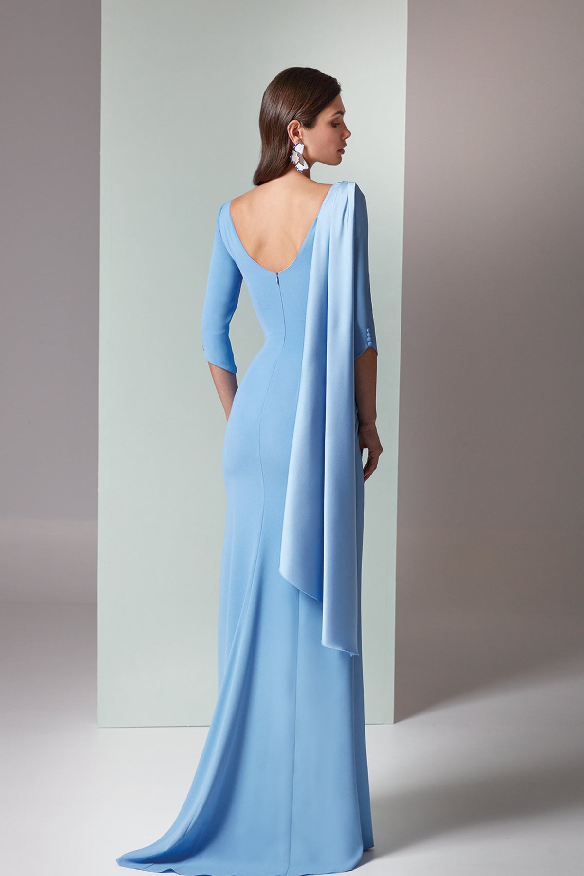 Blue crepe column dress. Featuring a jewel neckline with a fitted silhouette and three-quarter sleeves.