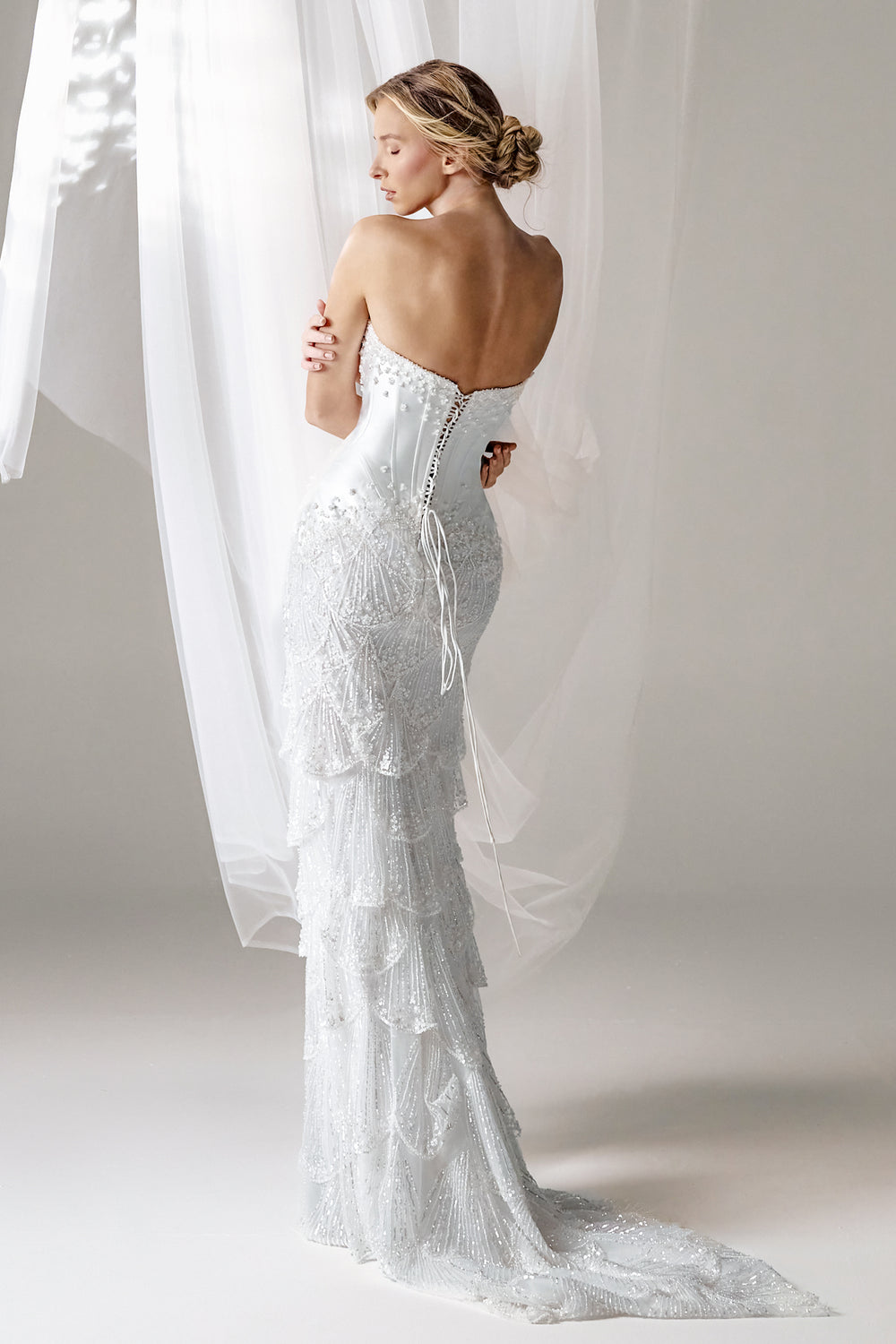 Strapless Bridal Dress with Scalloped Neckline and Cathedral Train