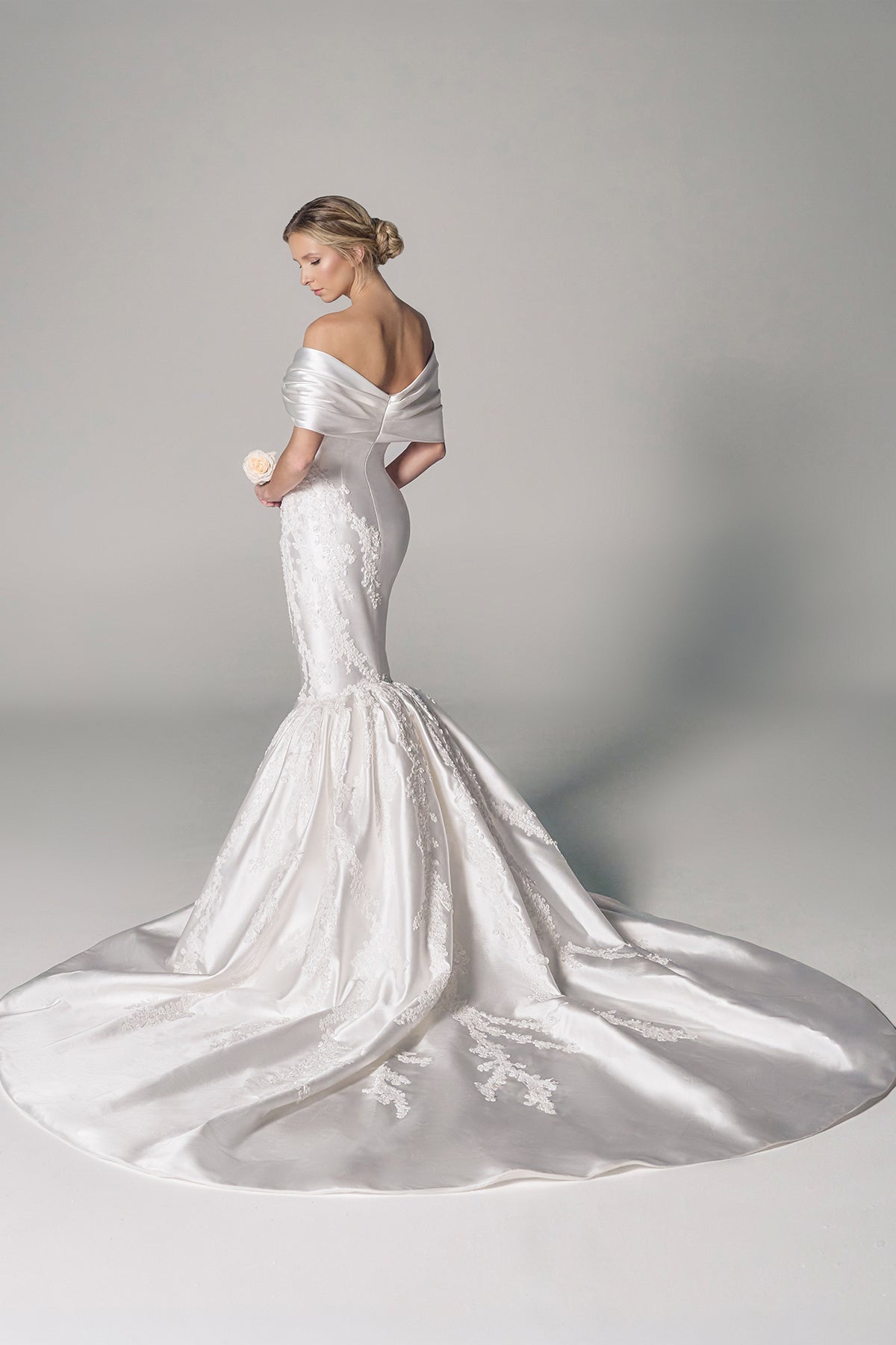 Crafted in off-white mikado, this gown features a sculpted fitted silhouette with a softly asymmetric draped bodice that frames the neckline. Refined broderie motifs accent the skirt and flow seamlessly into a long, dramatic train, creating depth and movement. Finished with clean lines and couture construction, the design balances modern elegance with timeless bridal sophistication.