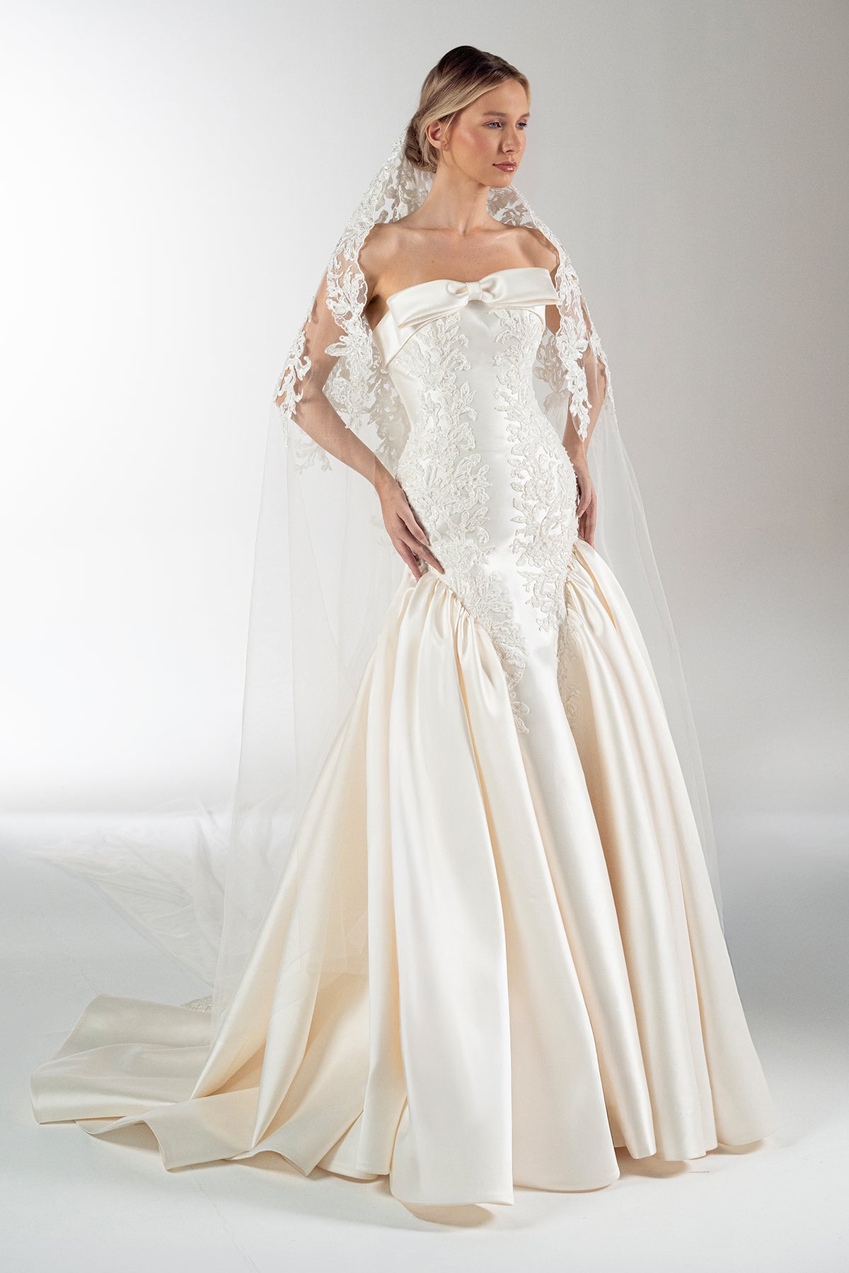 An ivory mikado gown featuring a sculpted fitted silhouette with a softly draped overskirt. The bodice is adorned with brodé lace motifs that extend seamlessly into the skirt, creating refined texture and depth. A structured satin bow defines the neckline, while a sheer lace veil completes the look with understated elegance.