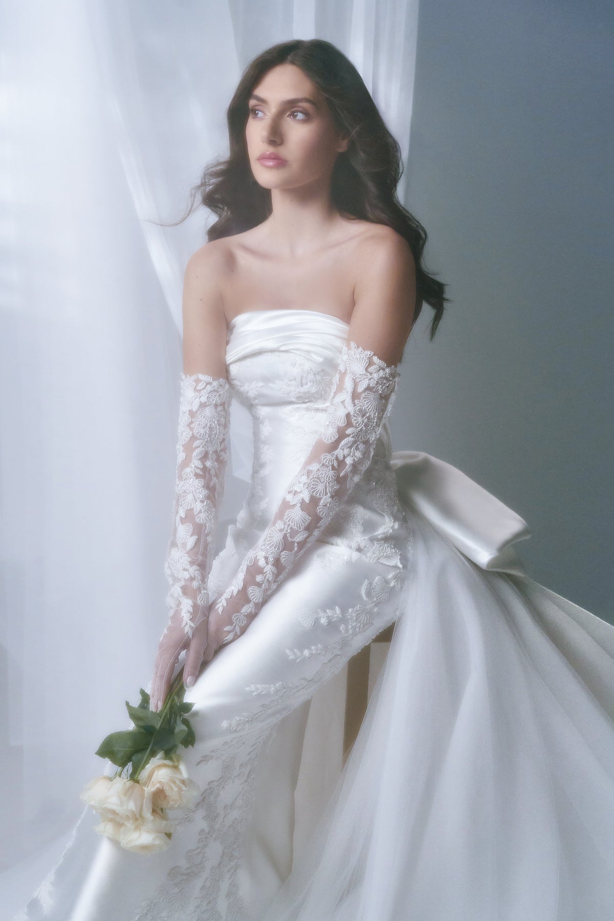 A strapless gown crafted in smooth off-white fabric, featuring a clean sculpted bodice with subtle embroidered accents. The silhouette is defined by a statement bow at the back and paired with long lace gloves. The look is completed with a fully embroidered lace veil that extends into a soft train, balancing structure with refined elegance.