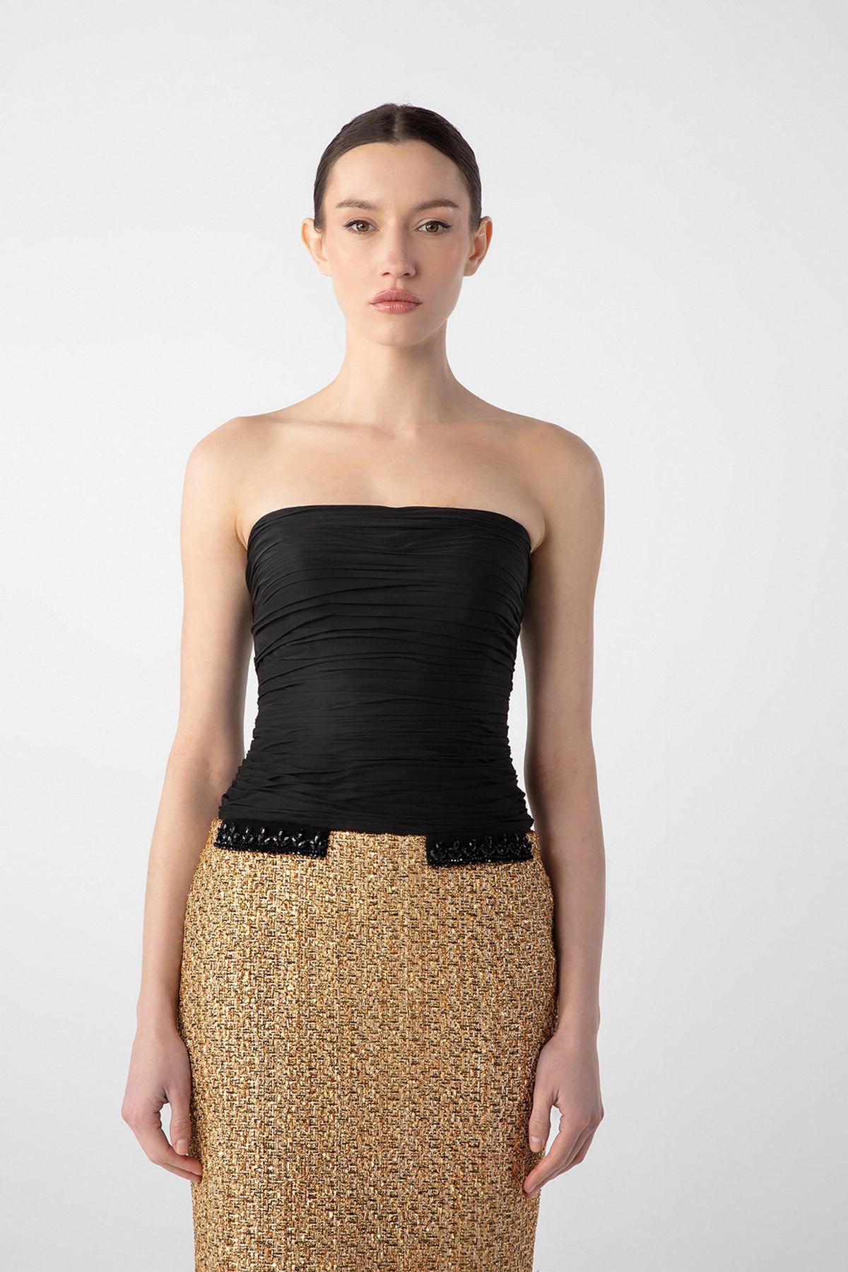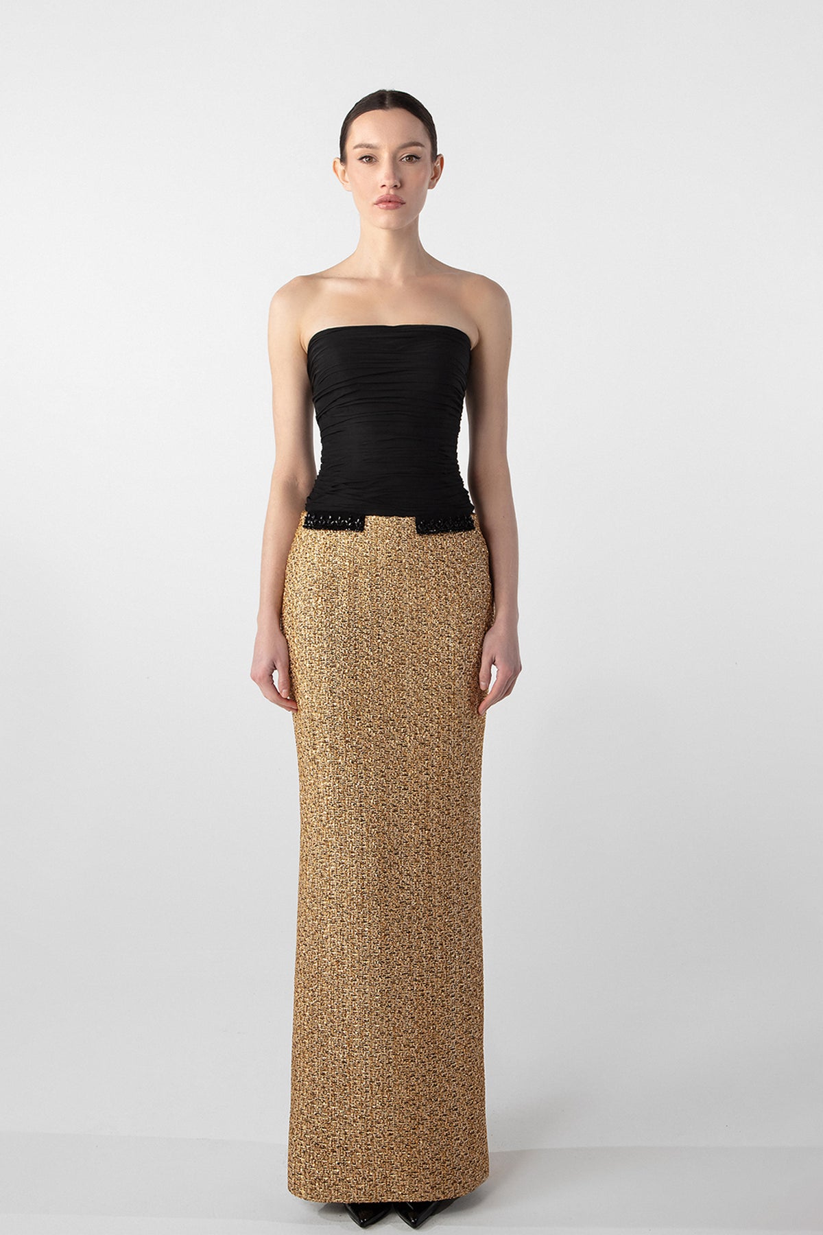 A refined column dress featuring a strapless chiffon-draped bodice, paired with a structured tweed skirt. The embroidered pocket details add a sophisticated touch, blending elegance with modern craftsmanship.
