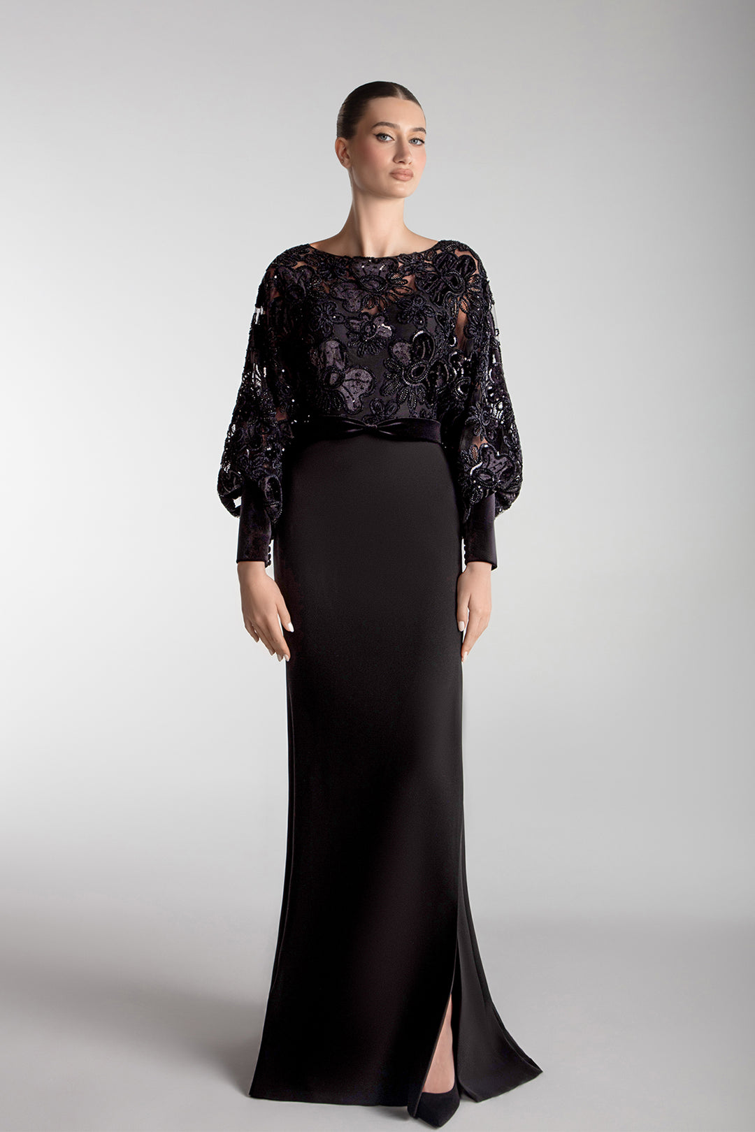 Blouson Bodice Gown With Floral Velvet Embroidery