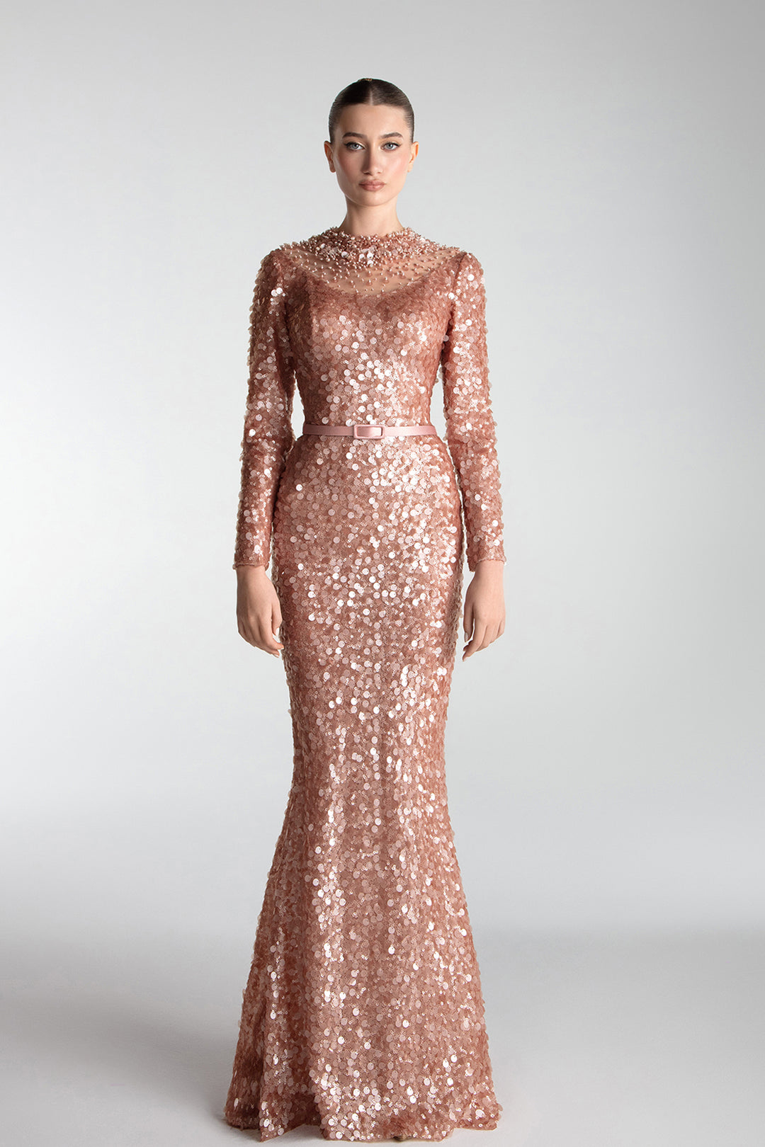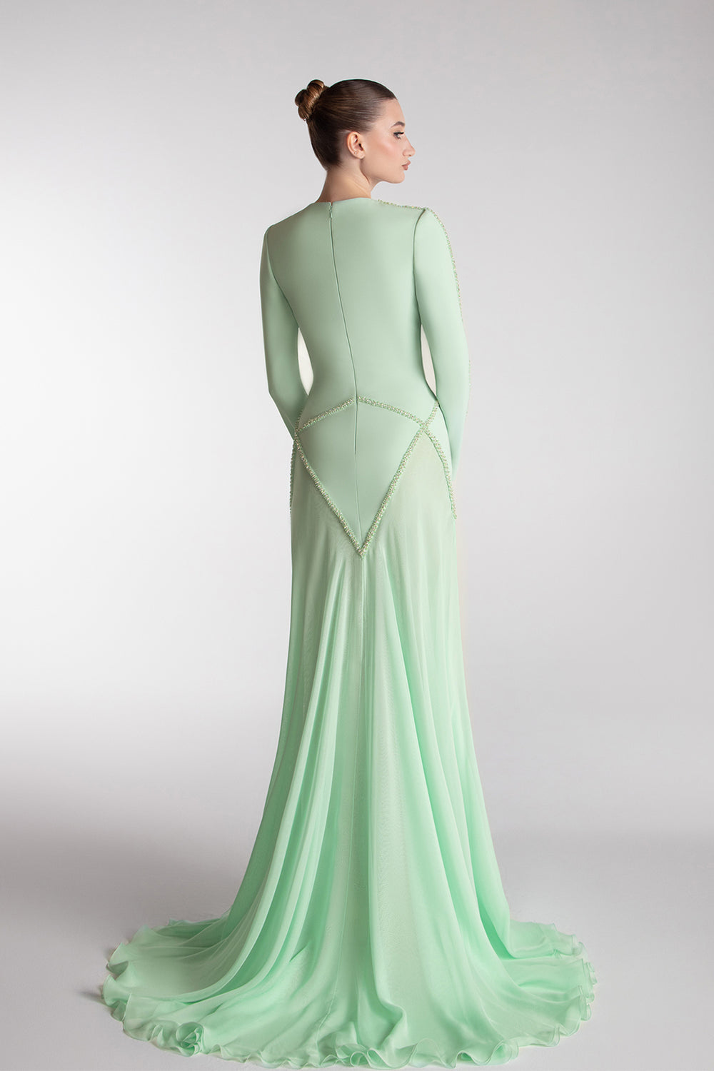 Structured Cape Sleeve Gown With Mirror Embroidery