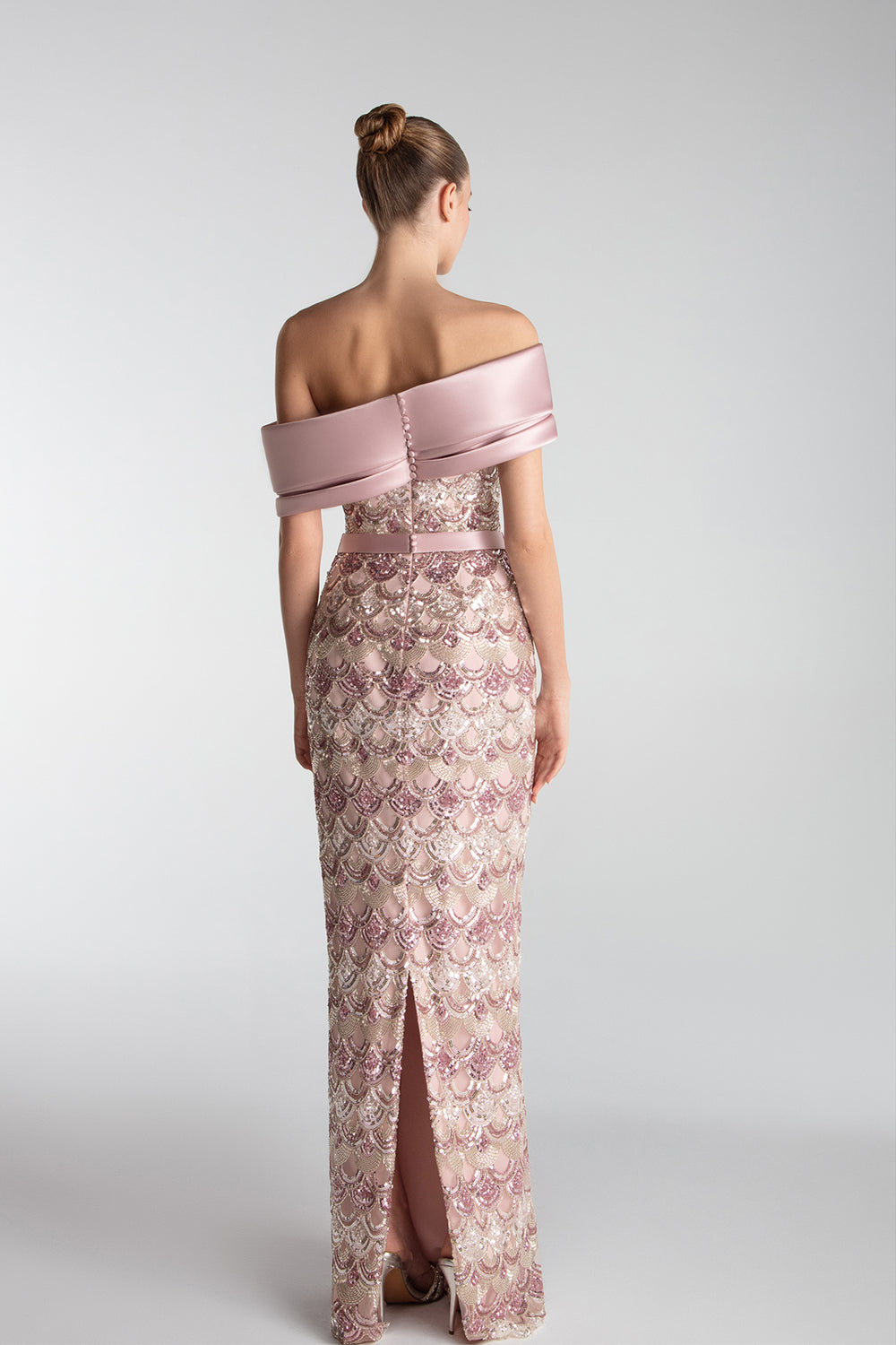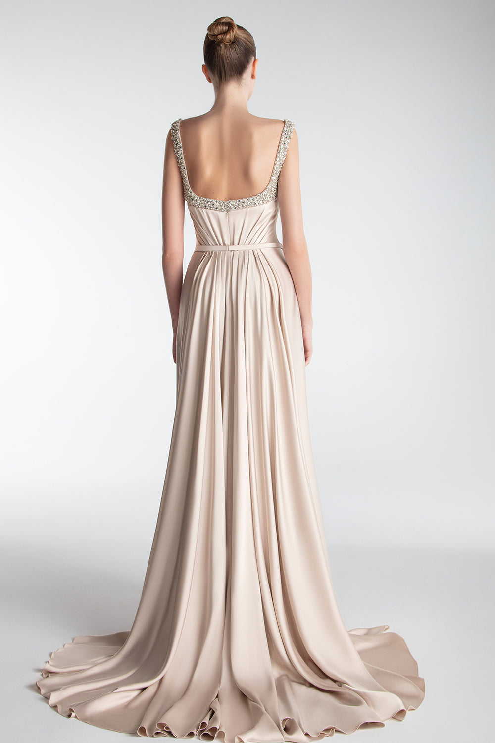Two-Tone Draped Satin Gown With Embroidered Neckline