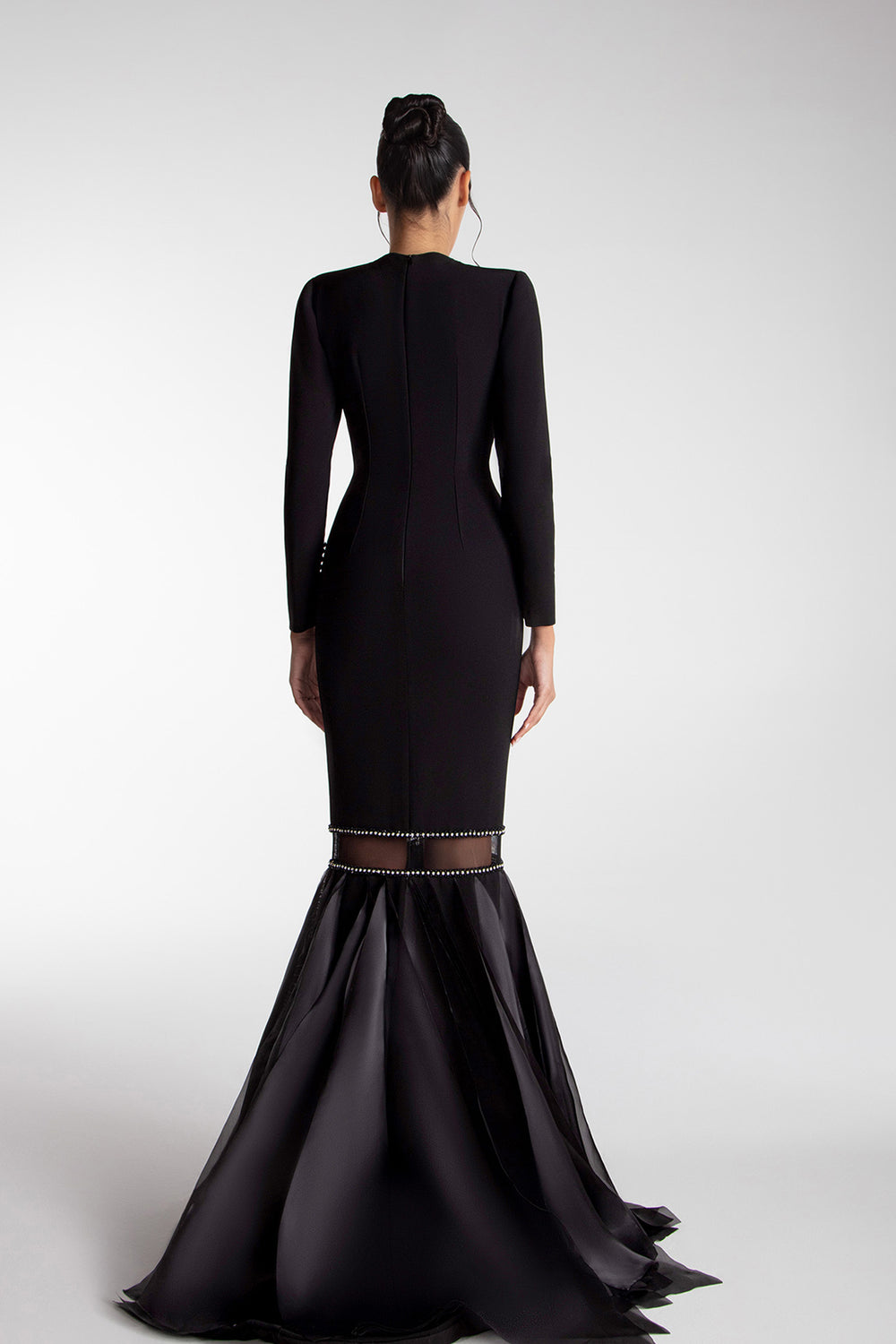 Off-the-Shoulder Crepe Dress with Tulle Sleeves