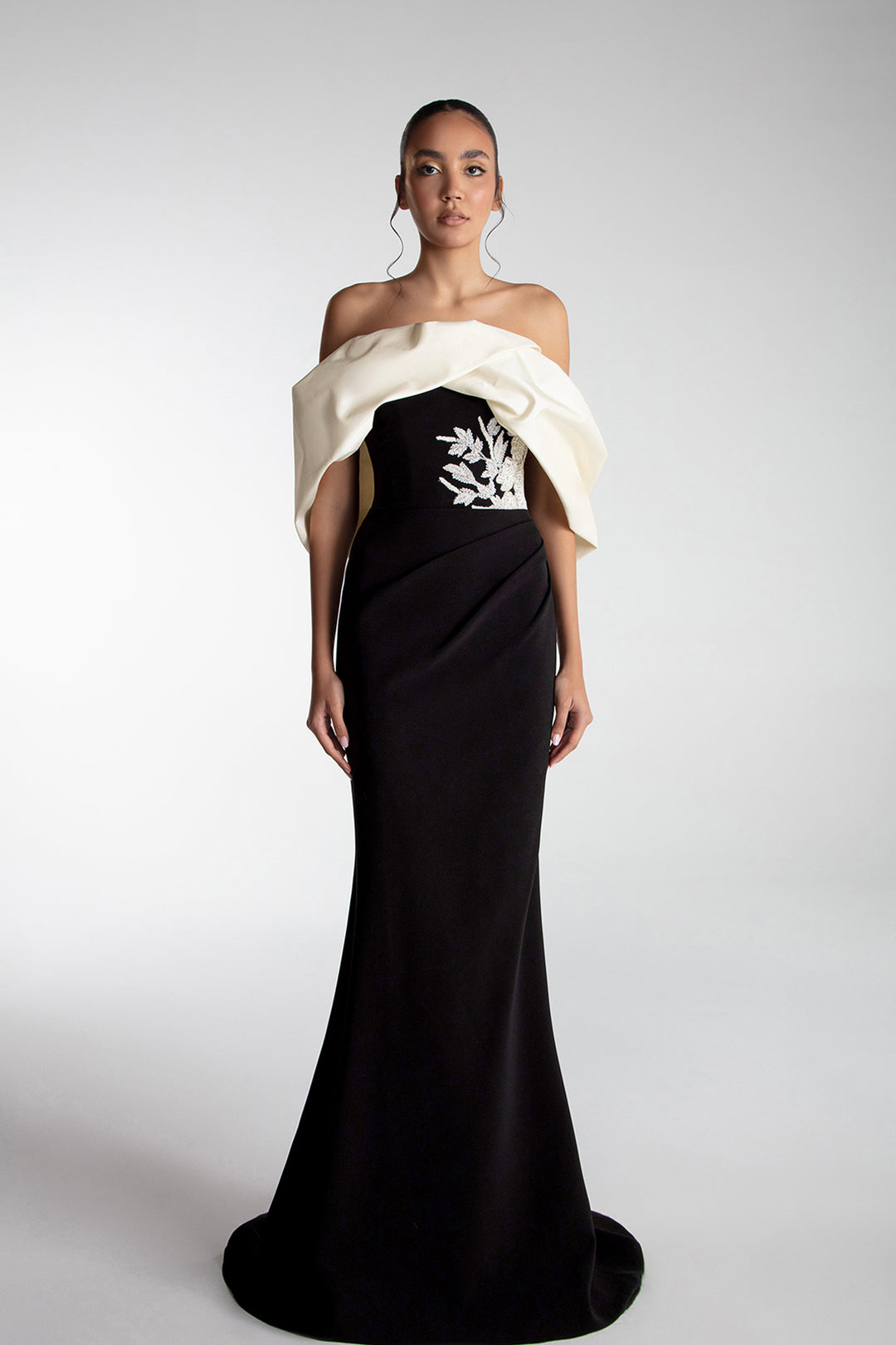 Strapless Gown With Draped Bodice And Sculptural Cape