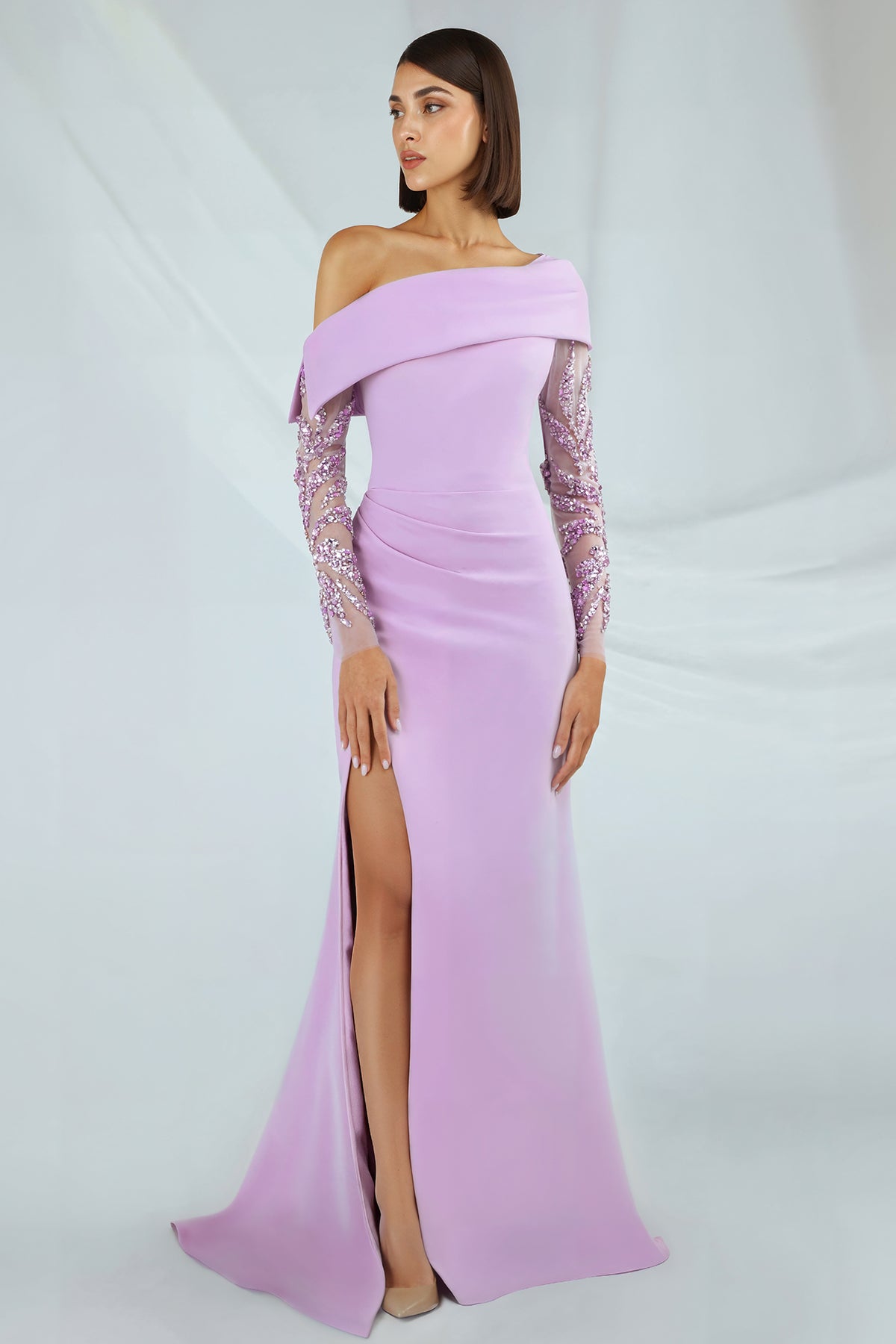 Lilac floor-length crepe dress. Featuring an off-the-shoulder neckline, hand-embroidered tulle sleeves. Complemented with a side slit and mermaid silhouette.