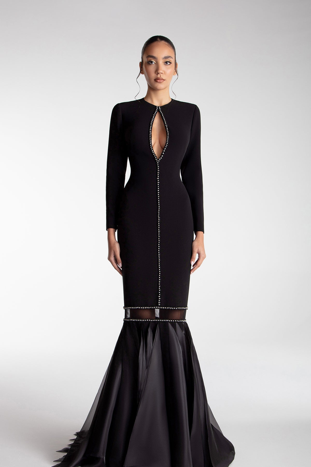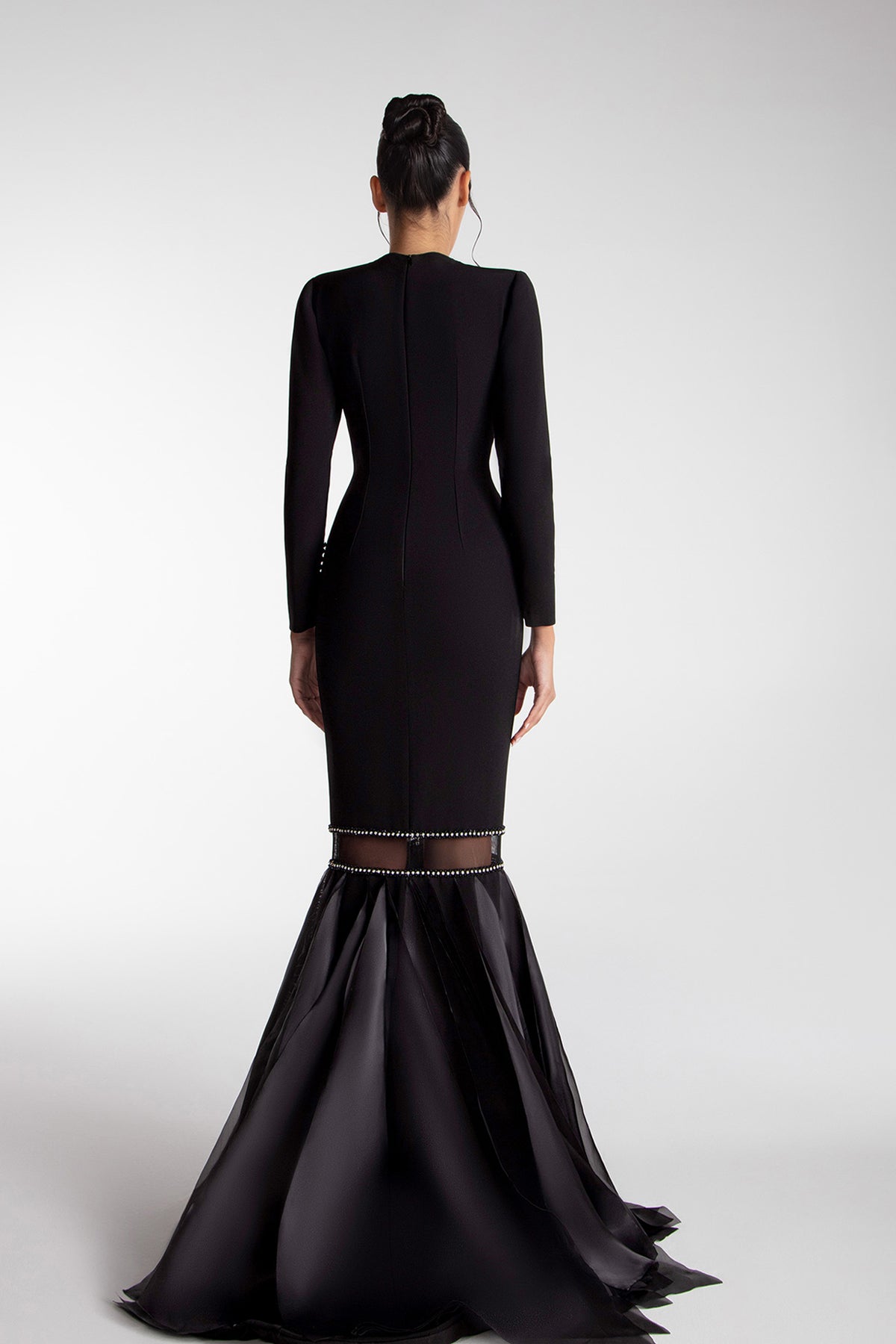 A sculpted crepe gown with long sleeves, accented by vertical seams trimmed with hand-applied Swarovski crystals in black and silver. The skirt opens into a mermaid-style flare crafted from laser-cut organza panels, separated by a sheer inset embellished with matching crystals.