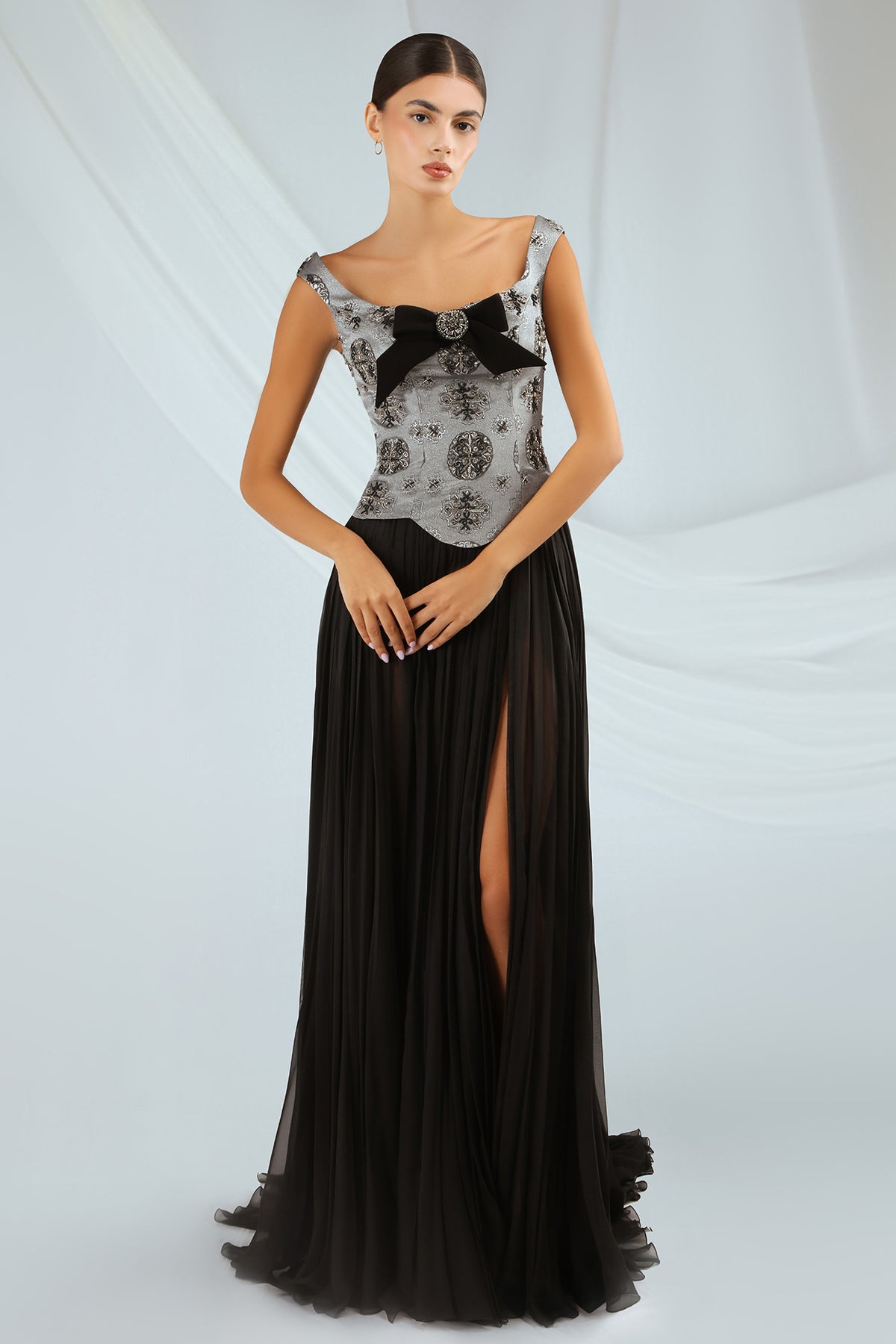 Gray and black floor-length dress. Featuring an embroidered jacquard bodice, with a chiffon skirt and slit. Complemented with cap sleeves, a square neckline, and a Mikado bow at the center bust. Completed with a flowing train.