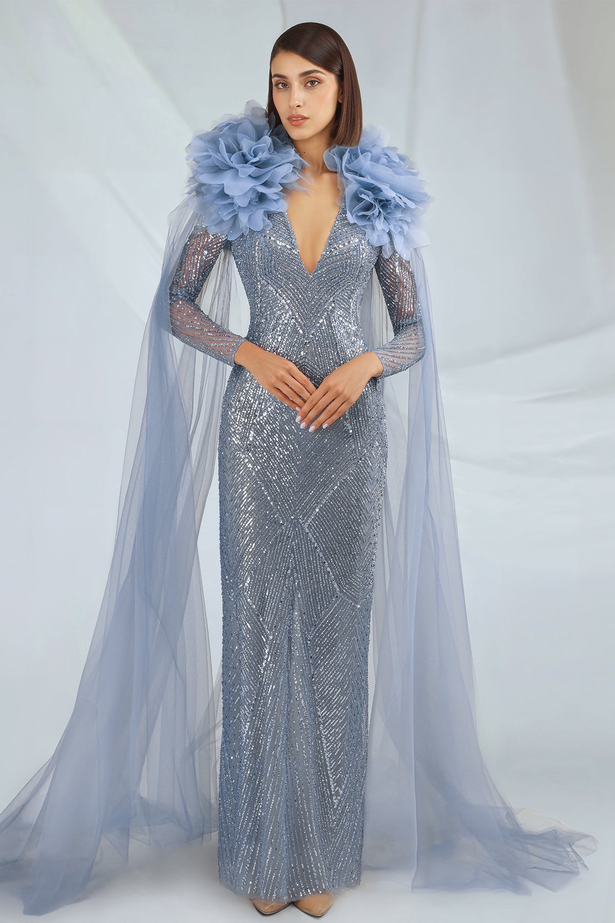 Blue full-length embroidered tulle dress. Featuring long sleeves, a plunging neckline, and with open back, organza flower accents at the shoulders. Complemented with an attached tulle cape.