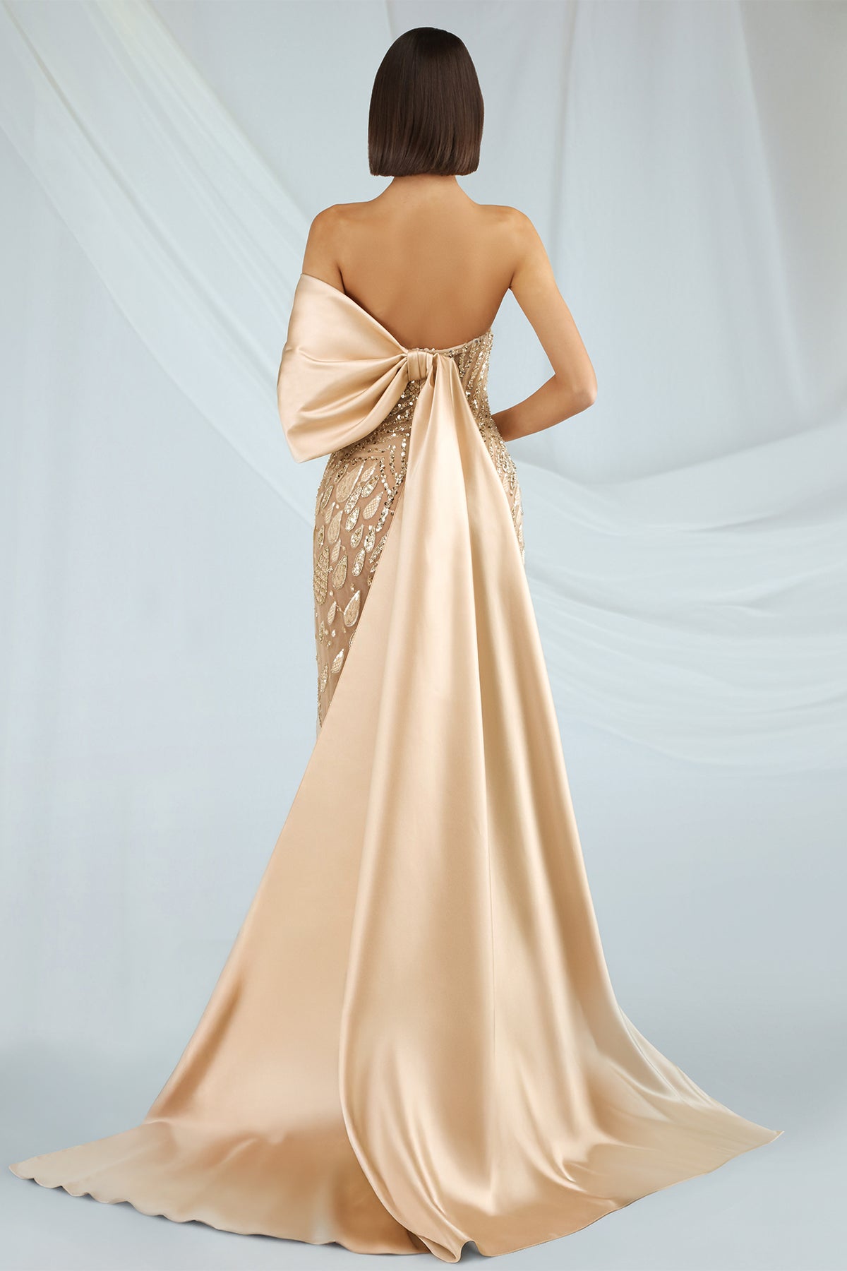 Champaign floor-length strapless Dress. Featuring an embroidered tulle body, with a satin duchesse bow at the neckline. Complemented with a high slit, and train.