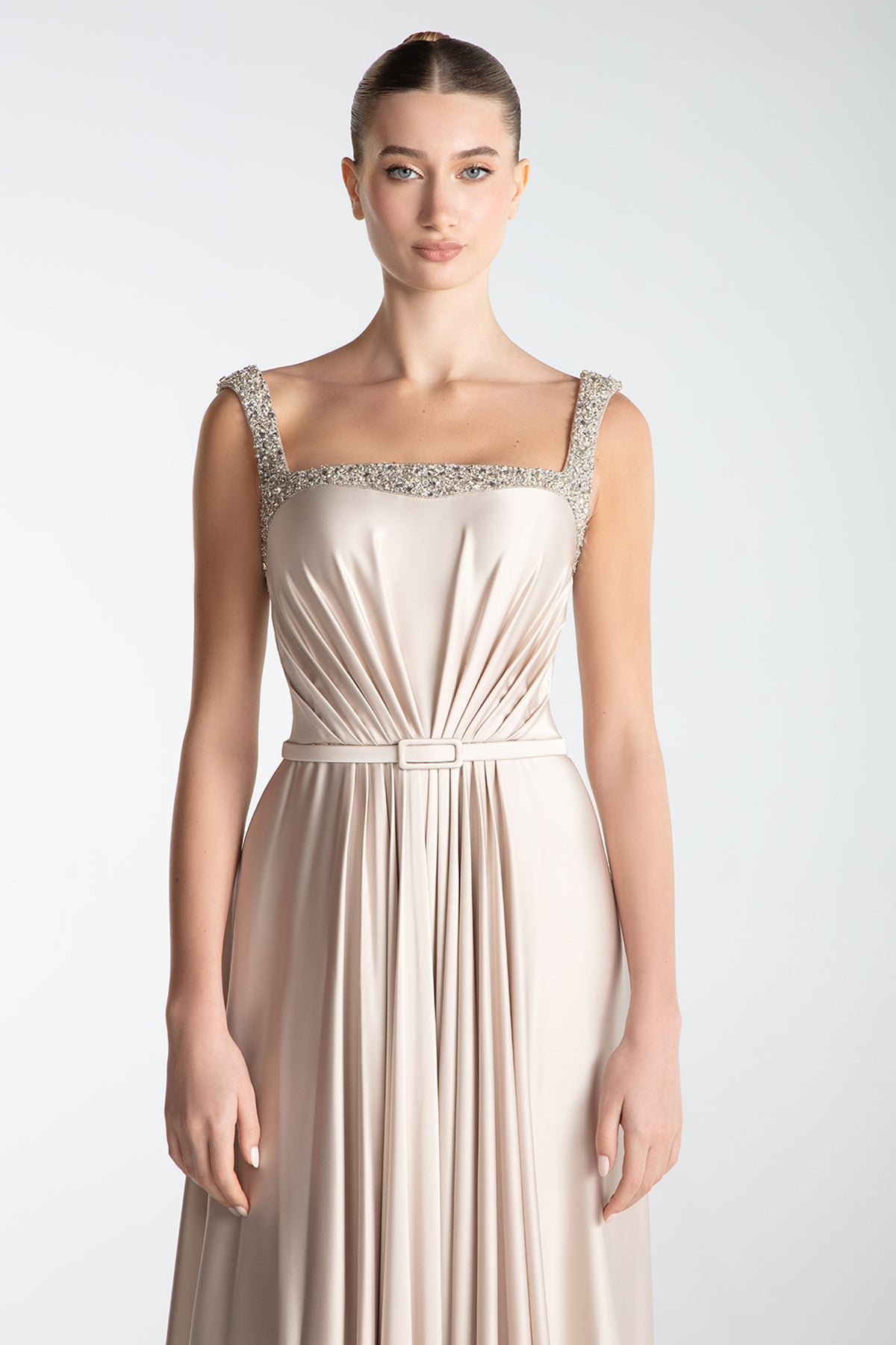 Floor-length gown crafted from pleated satin with structured draping along the bodice and waist. Features a square neckline framed by hand embroidered Swarovski crystals on the straps. A narrow satin belt accentuates the waist, and the full pleated skirt extends into a soft train.