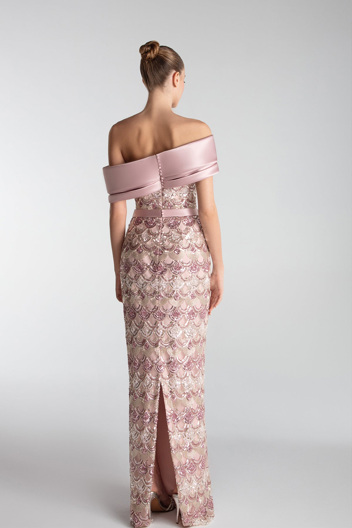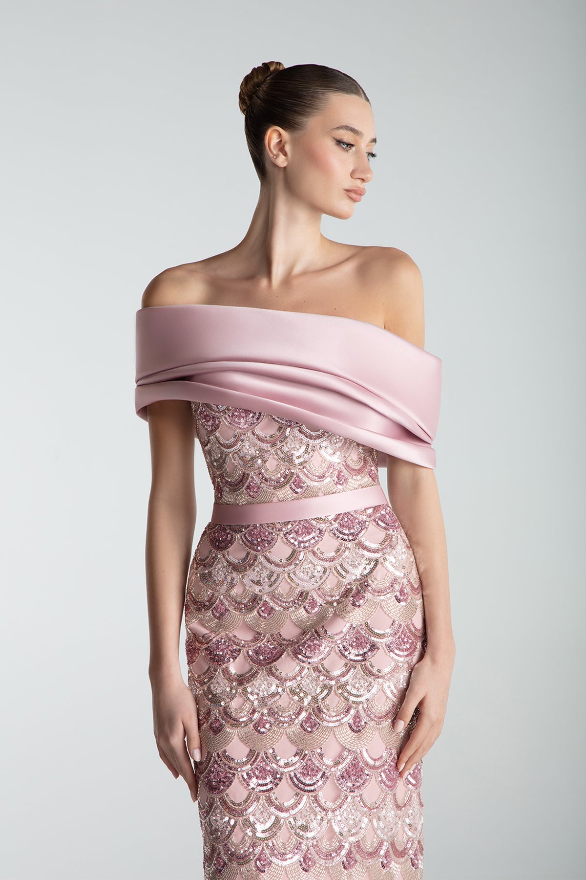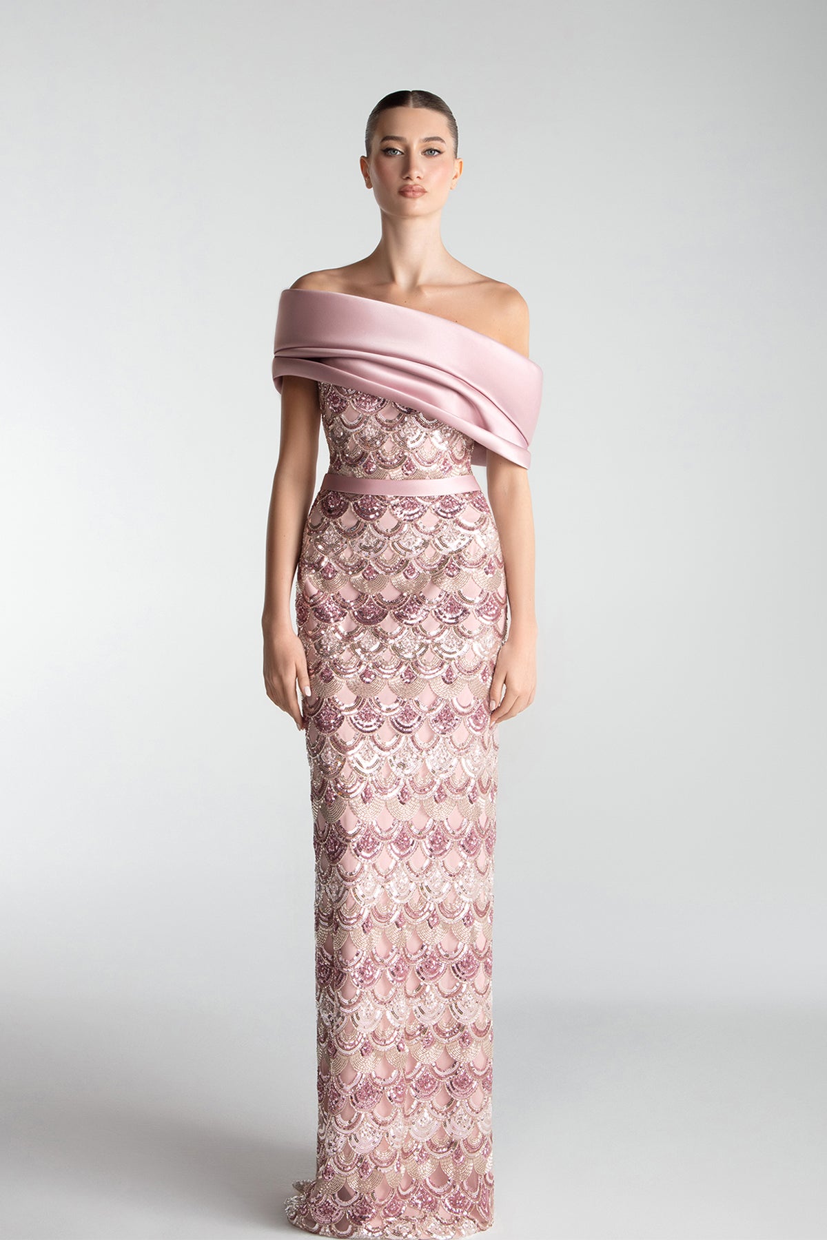 A structured column gown featuring a sculpted off-shoulder neckline in thick satin. The bodice and skirt are fully hand-embroidered with sequins and beads in a scalloped pattern. Finished with a satin belt and a center back slit for movement.