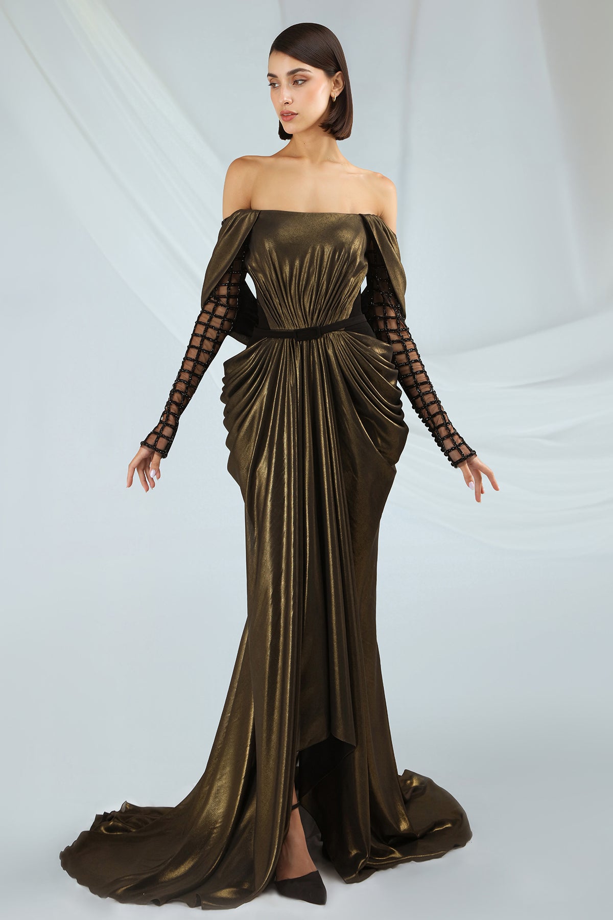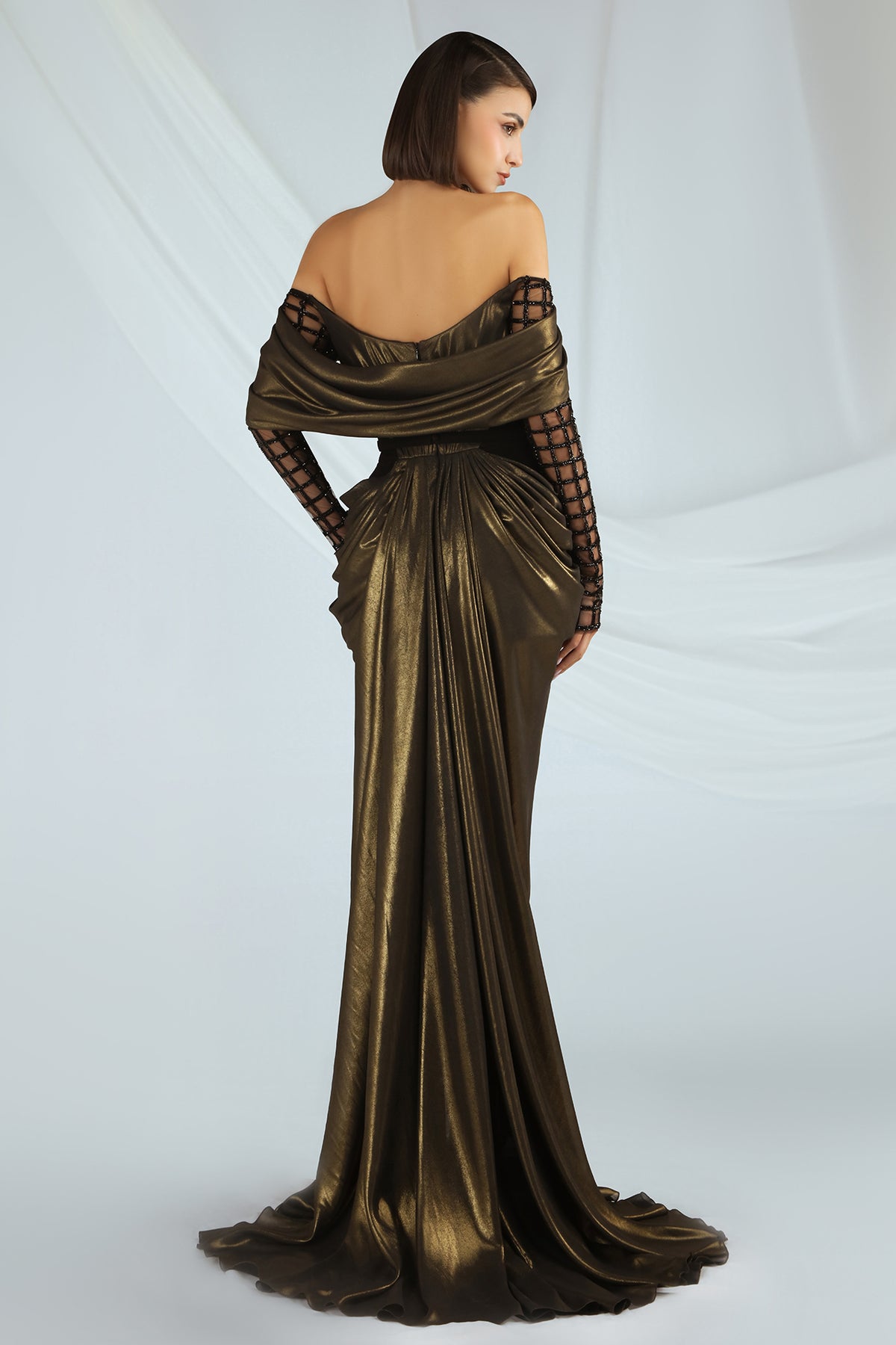 Antique gold floor-length dress. Featuring an off-the-shoulder neckline and hand-embroidered bodice detail. Complemented with a ruched side, thigh-high slit, and train.