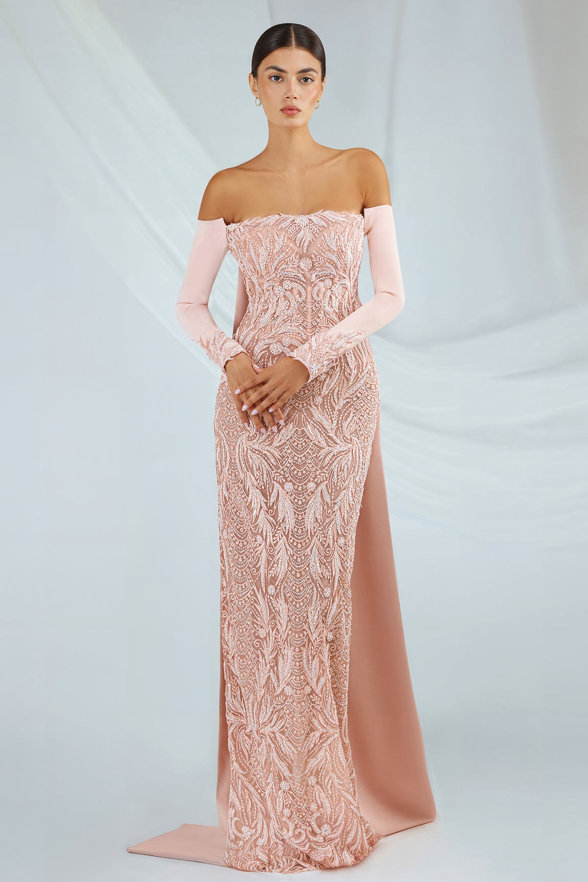 Light powder floor-length off-the-shoulder dress. Featuring an embroidered tulle bodice and skirt, crepe sleeves, and a cape. Complemented with a fitted silhouette and back slit.