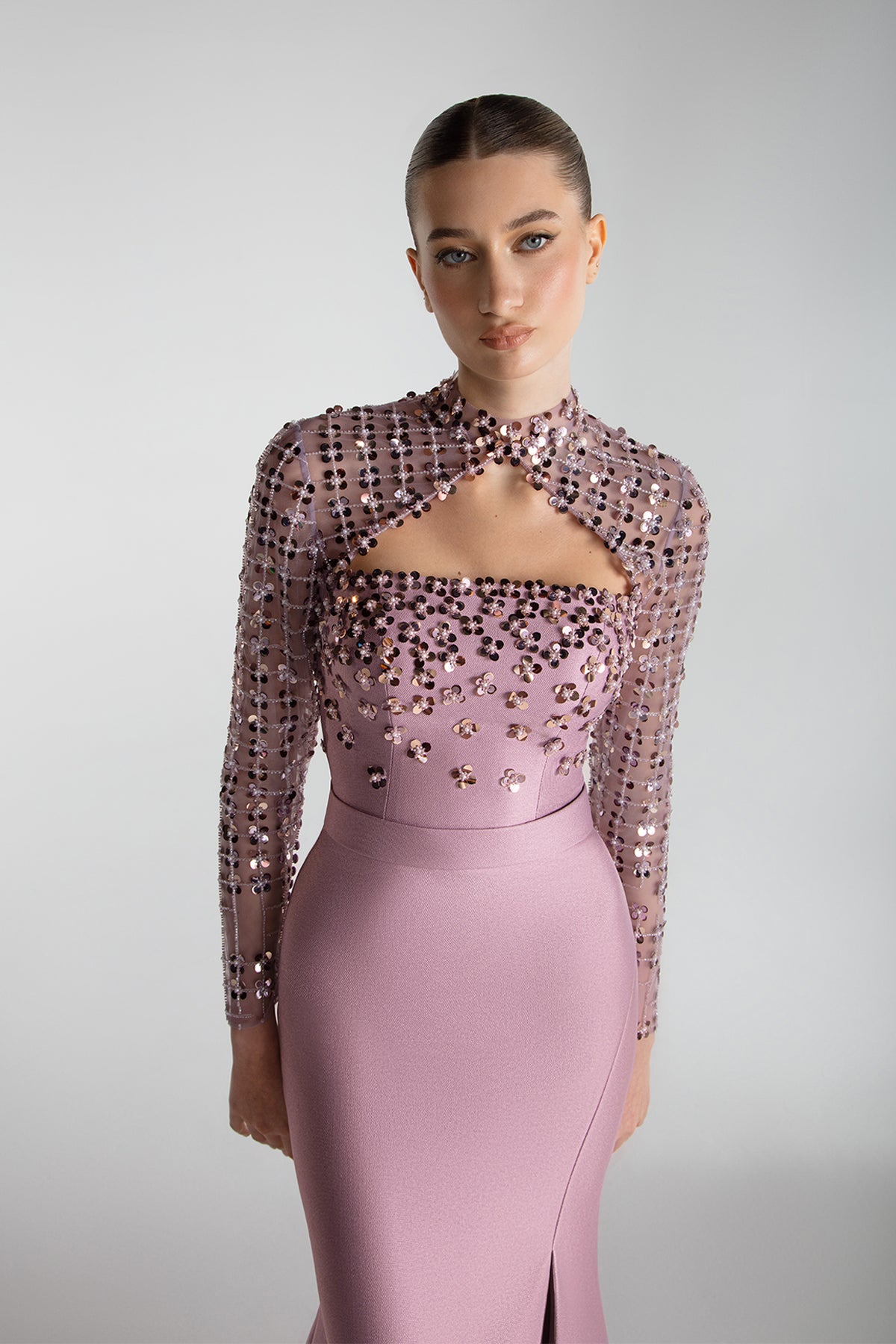 Tailored in cadi fabric this fitted mermaid gown features a square neckline and structured cape-style bolero attached at the neck and sleeves. The bodice is richly hand-embroidered with mirrored paillettes and crystals balanced by a clean flared skirt with front slit and soft train. A tonal belt accentuates the waistline.