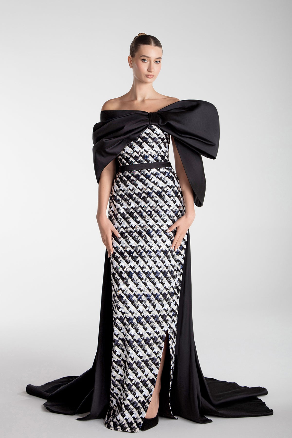 This off-shoulder column gown features a structured silhouette crafted from embroidered sequins. A sculptural taffeta bow wraps across the neckline and cascades into a train, while a black waistband defines the shape. A side slit adds movement to the tailored finish.