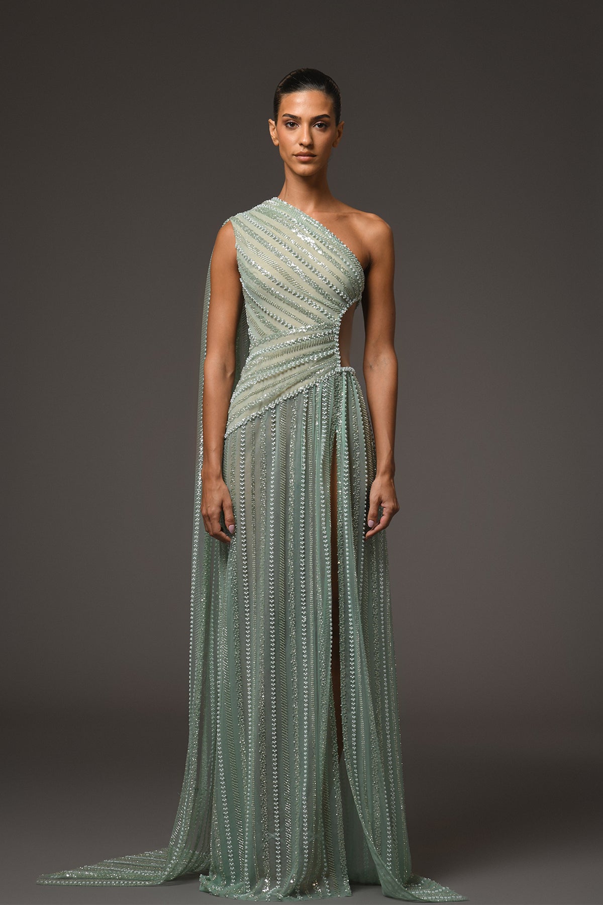 Green long dress. Featuring one-shoulder embroidered tulle and sheer tulle. Complemented with a side-waist cutout, asymmetrical and back slit.