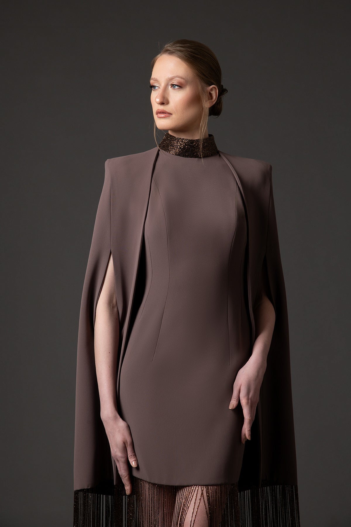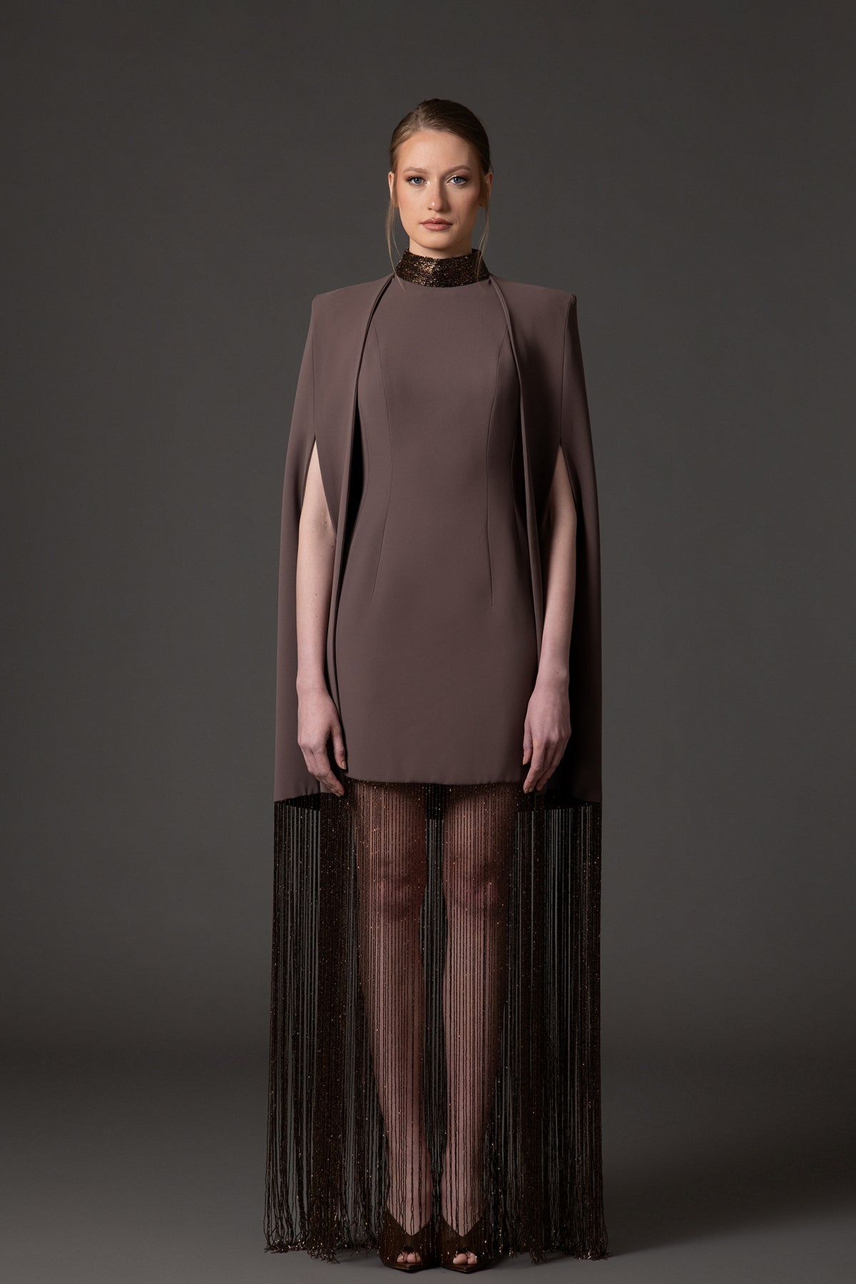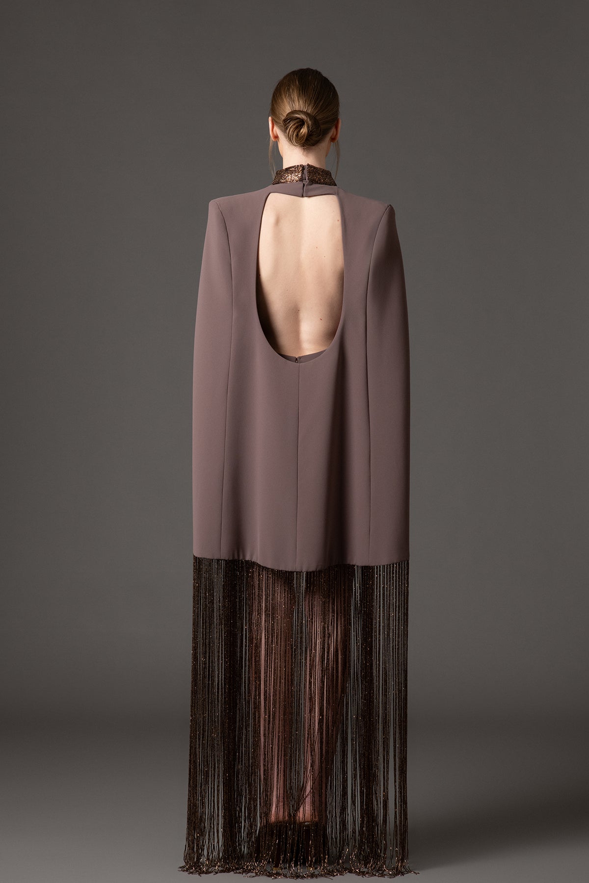 Brown crepe cape dress. Featuring a beaded fringes with an open back cape and center back zipper.