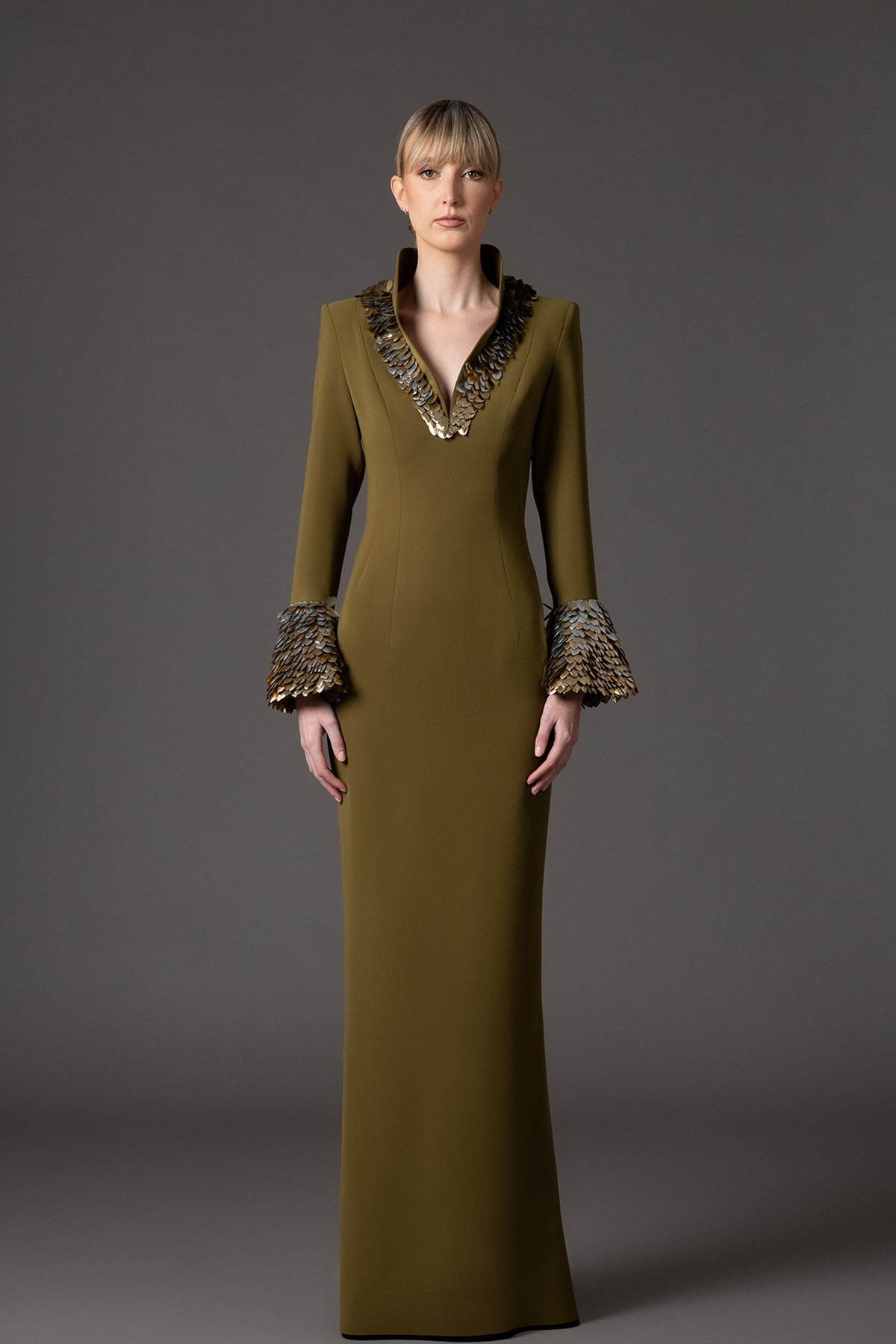 Olive green column long dress. Featuring a crepe fabric 3D leaf embellishment with a bell sleeves back zipper and back slit.