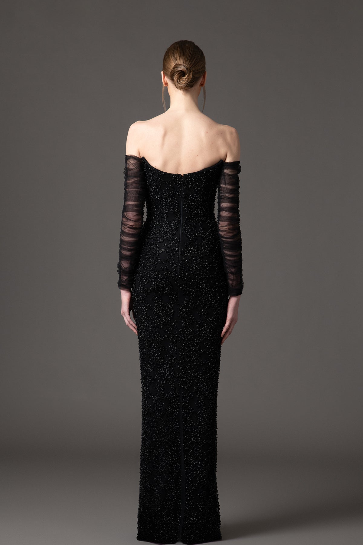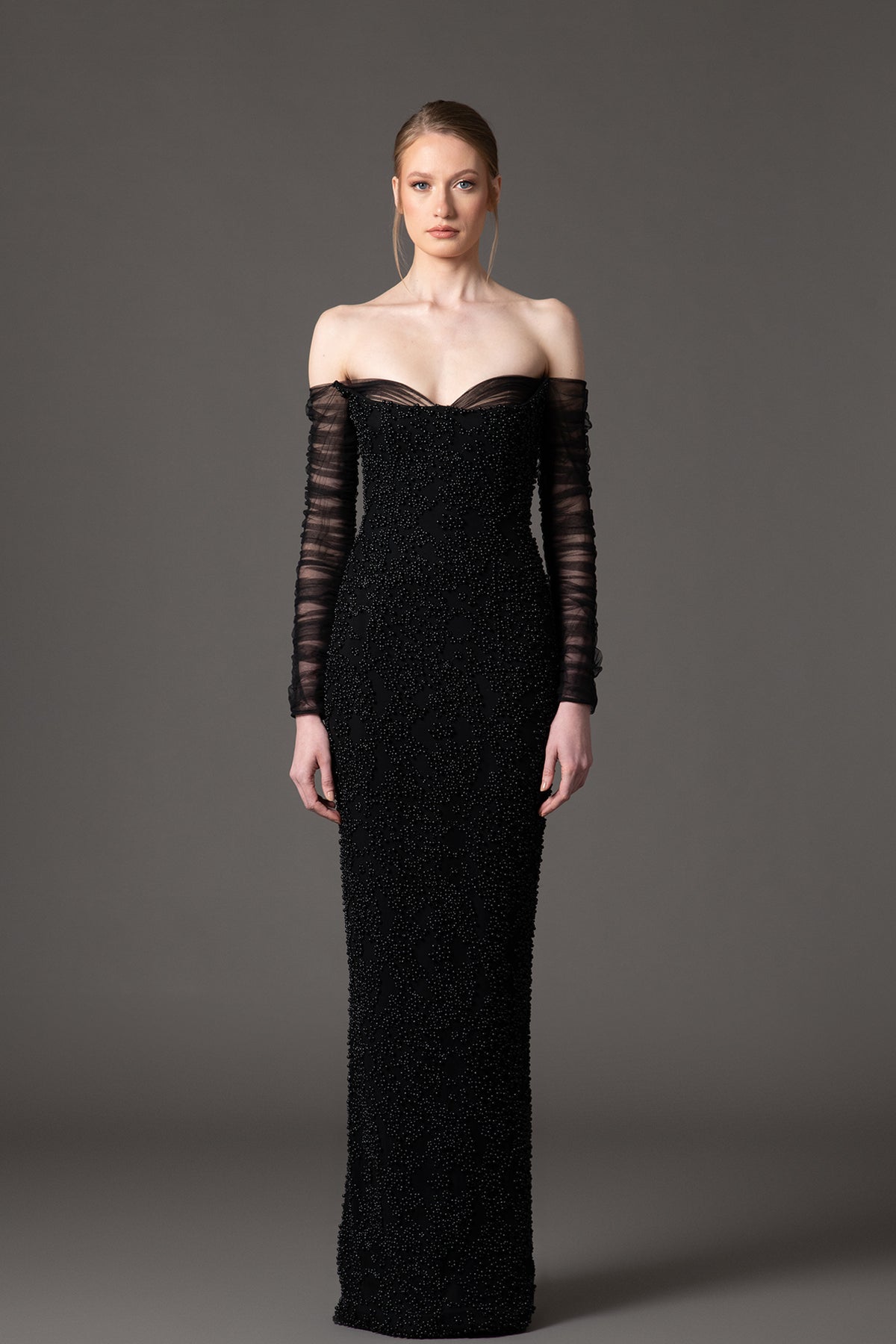 Black column crepe dress. Featuring a tulle sleeves with an off-the-shoulder embroidered neckline.