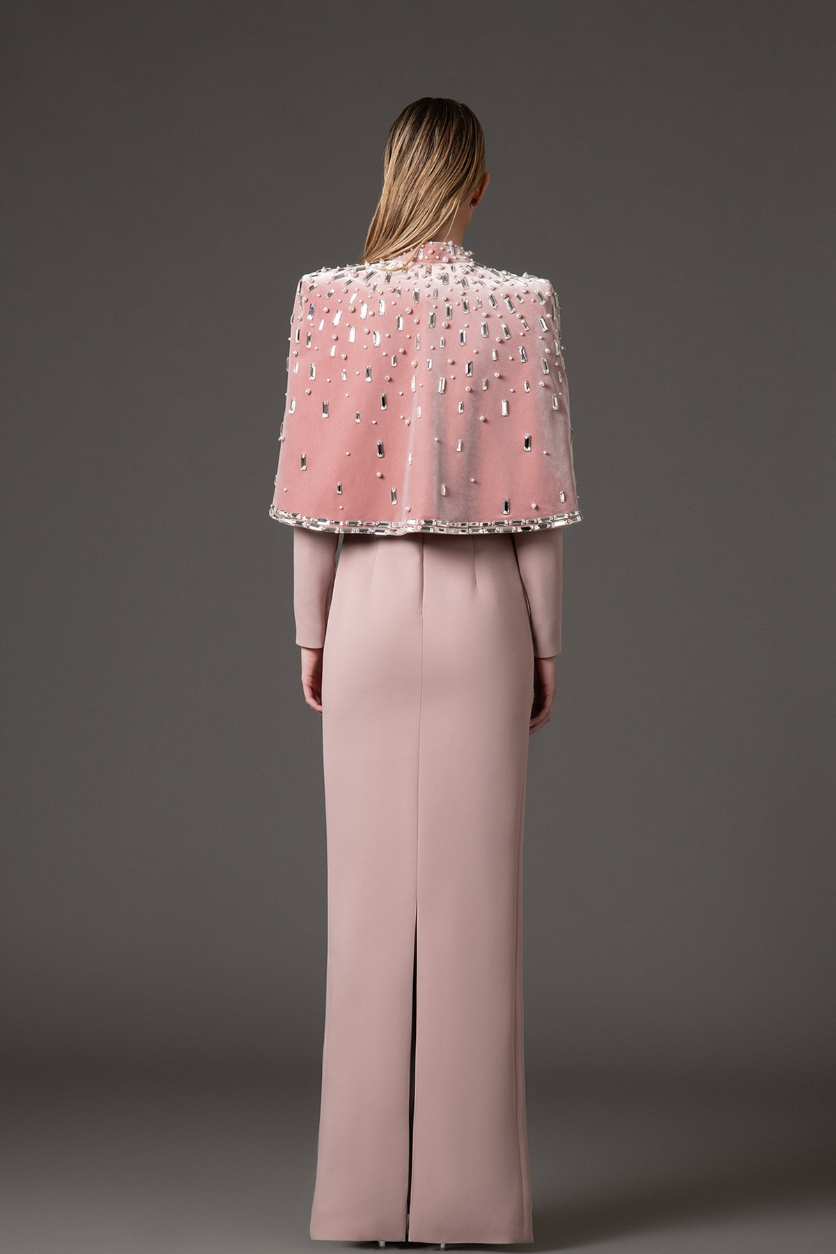 Vintage rose crêpe dress. Featuring a paired embroidered velvet bolero with a back slit.