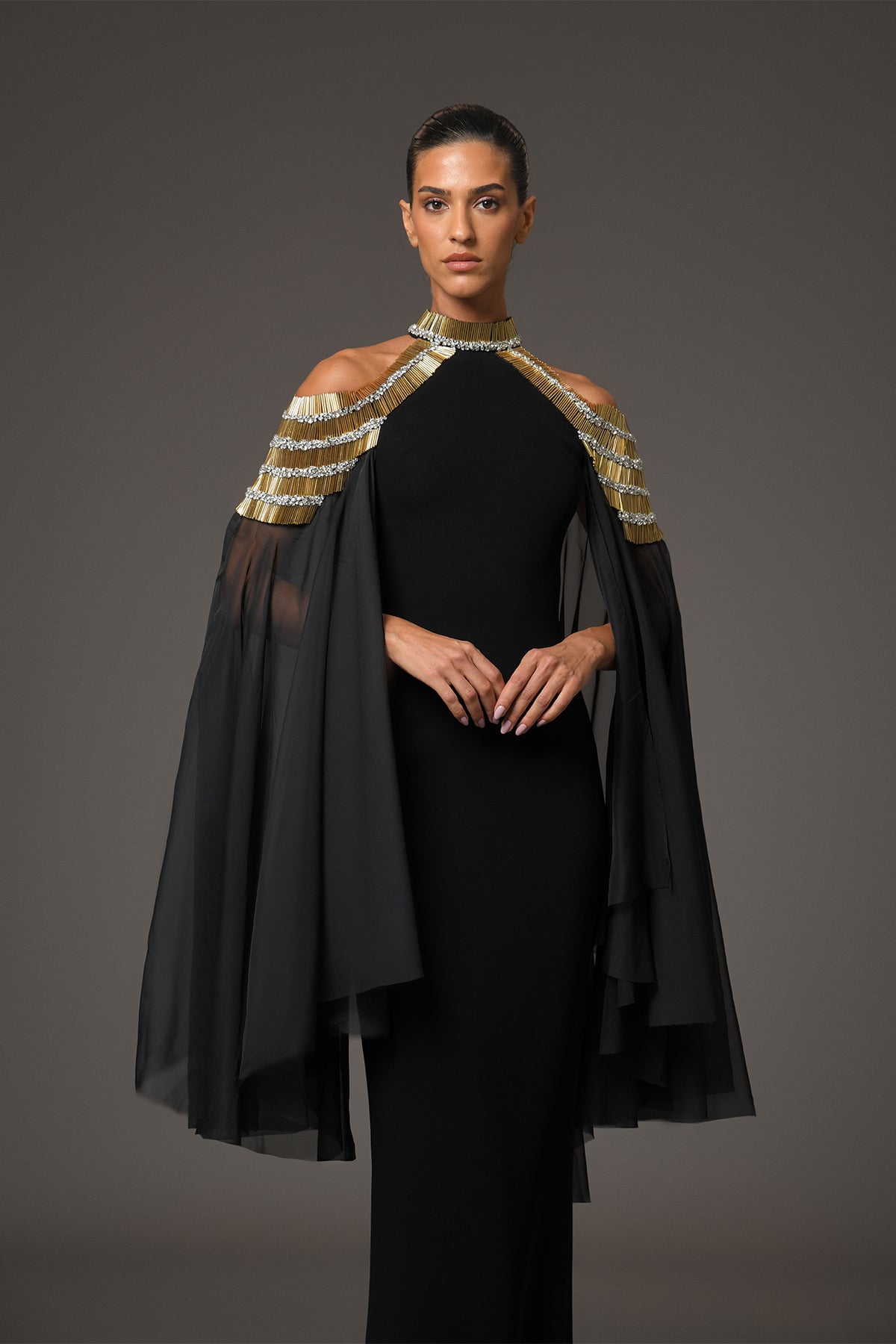 Black crêpe long dress. Featuring chiffon embroidery and bugle beads, open shoulders. Complemented by Cape sleeves, a center back zipper, and a back slit.