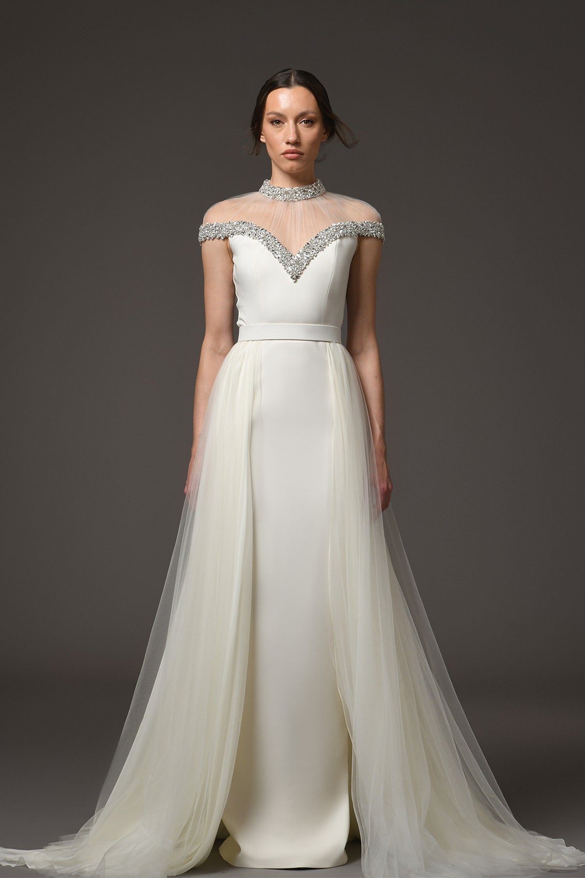 White crêpe long dress. Featuring a crystal embroidery and a tulle overskirt. Complemented with a sheer tulle and high-neck, and a back slit.