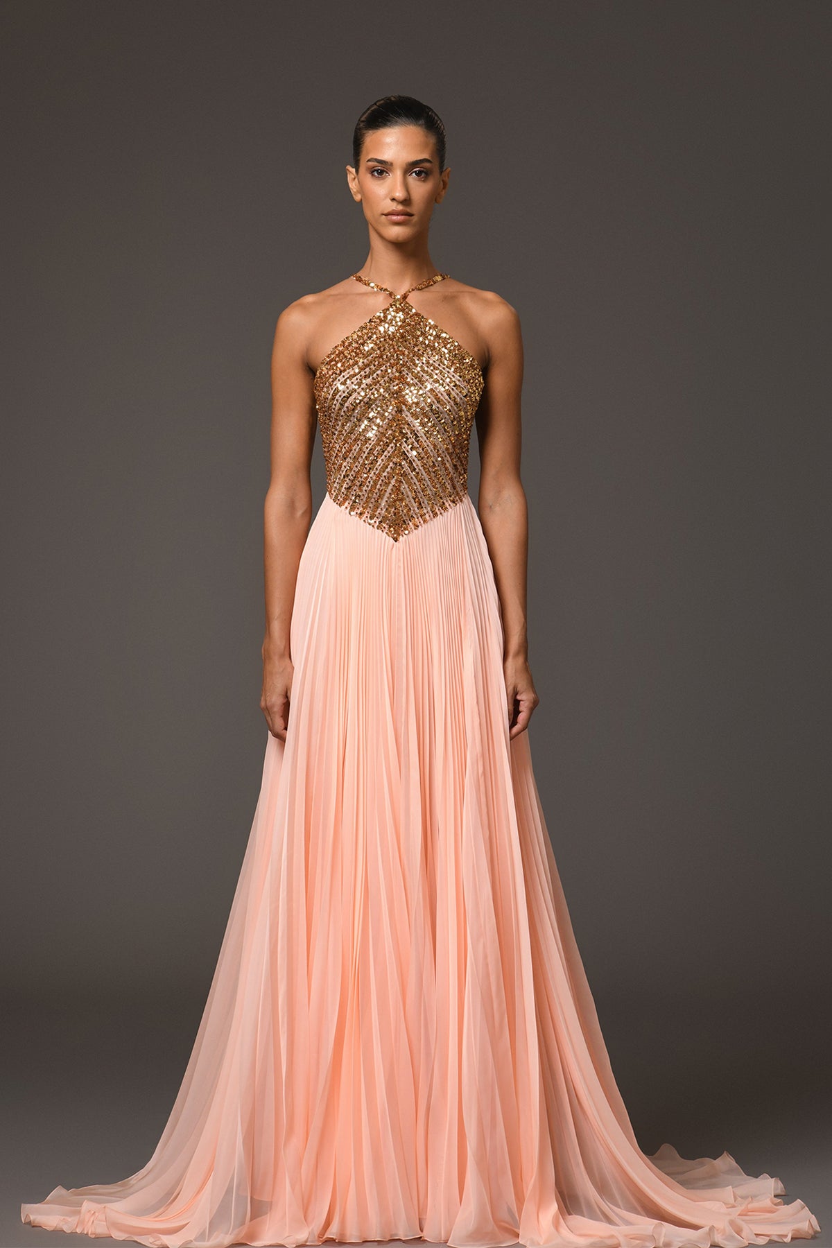 Peach sequins long dress. Featuring a plissé halter-neck. Complemented with gold embroidery.