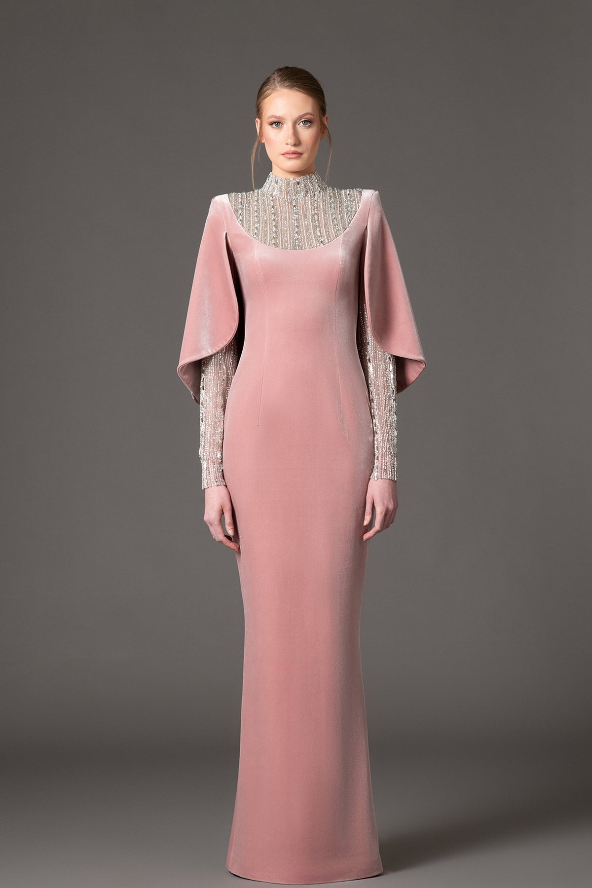 Vintage rose long dress. Featuring a velvet baguette and crystal embroidery with long sleeves and back zipper with back slit.