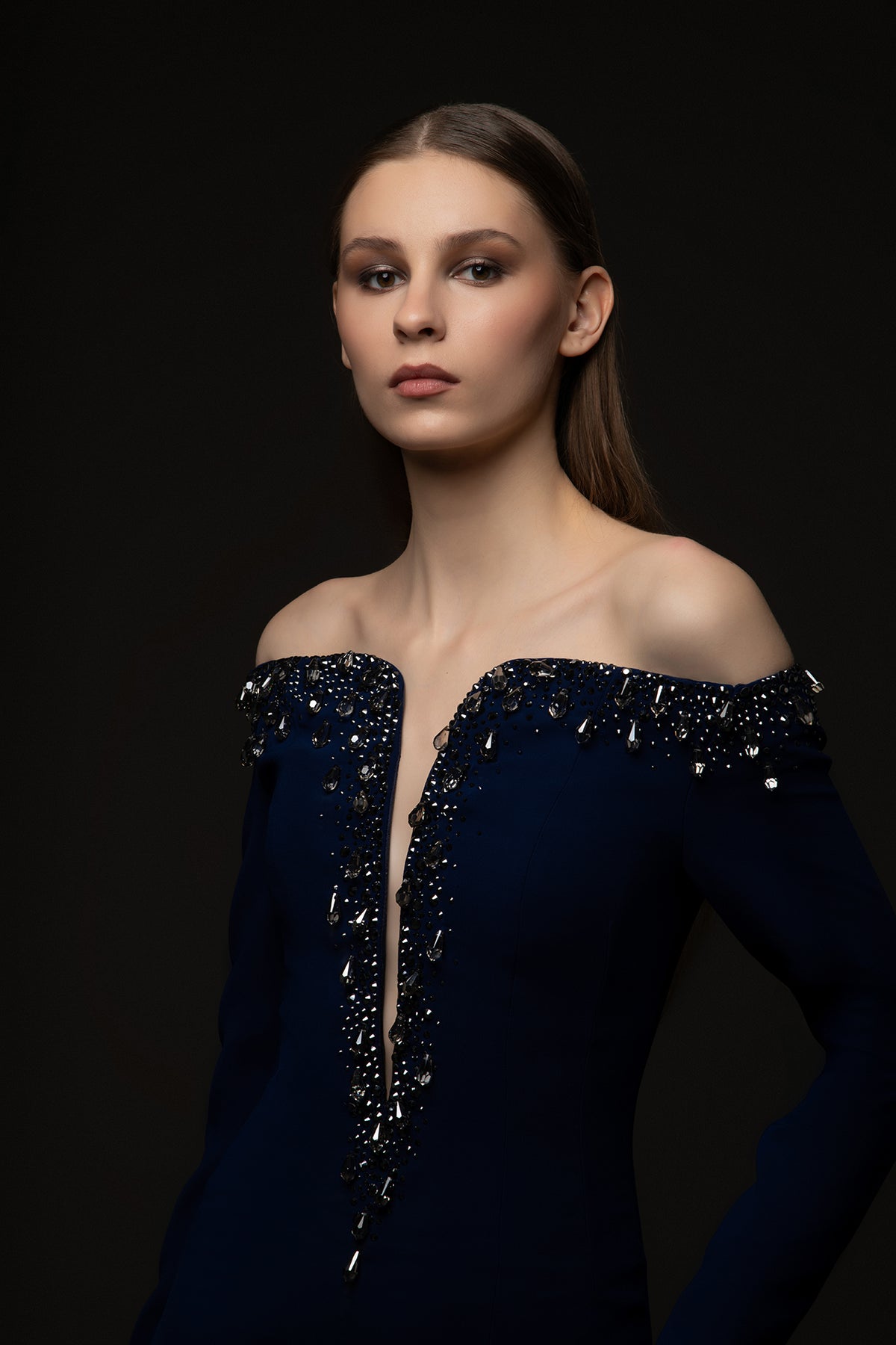 Blue crepe column long dress. Featuring an off-the-shoulder with a fitted and long sleeve silhouette.