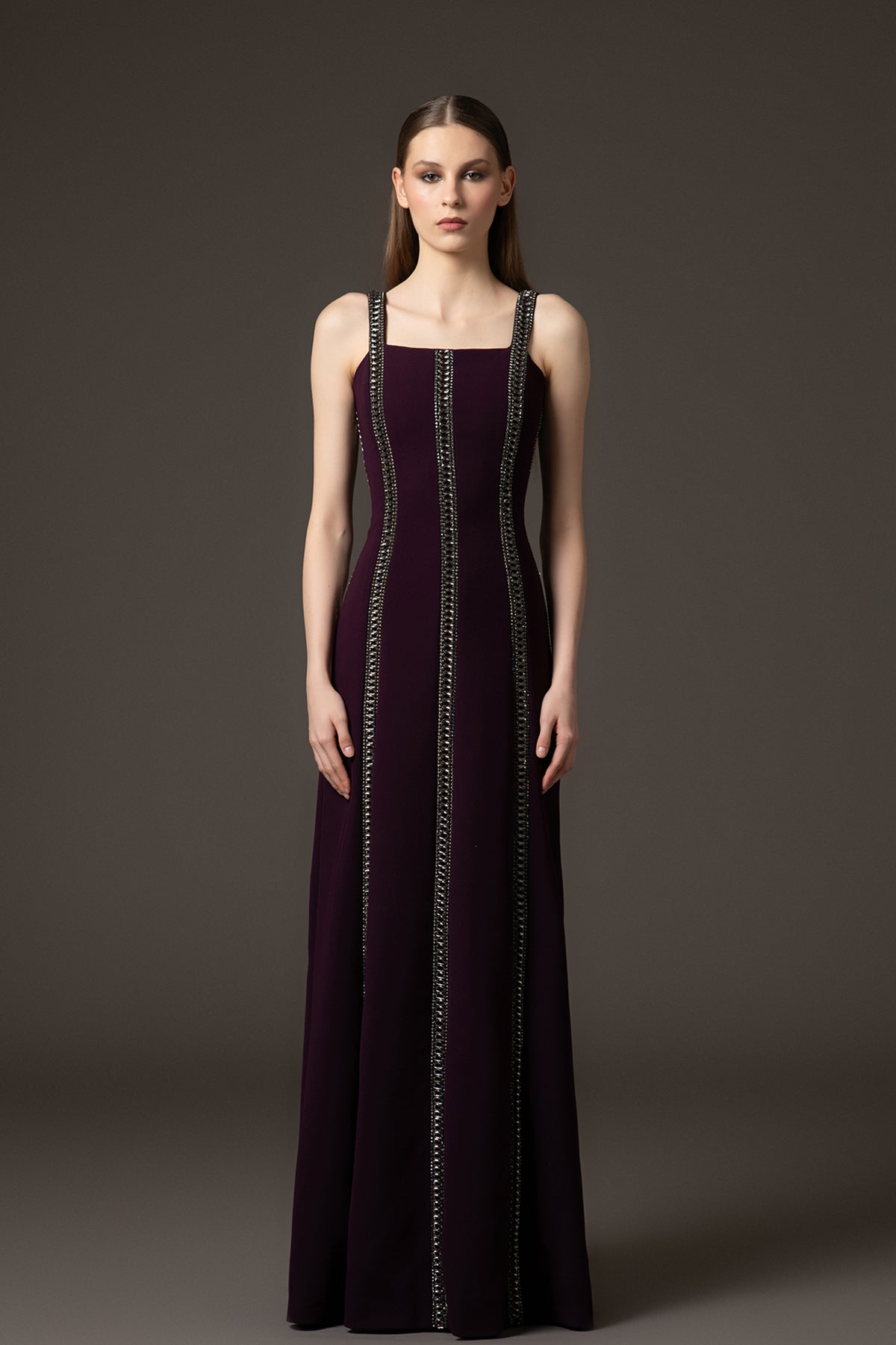 Burgundy crepe A-line long dress. Featuring with an open neckline and sleeveless design.