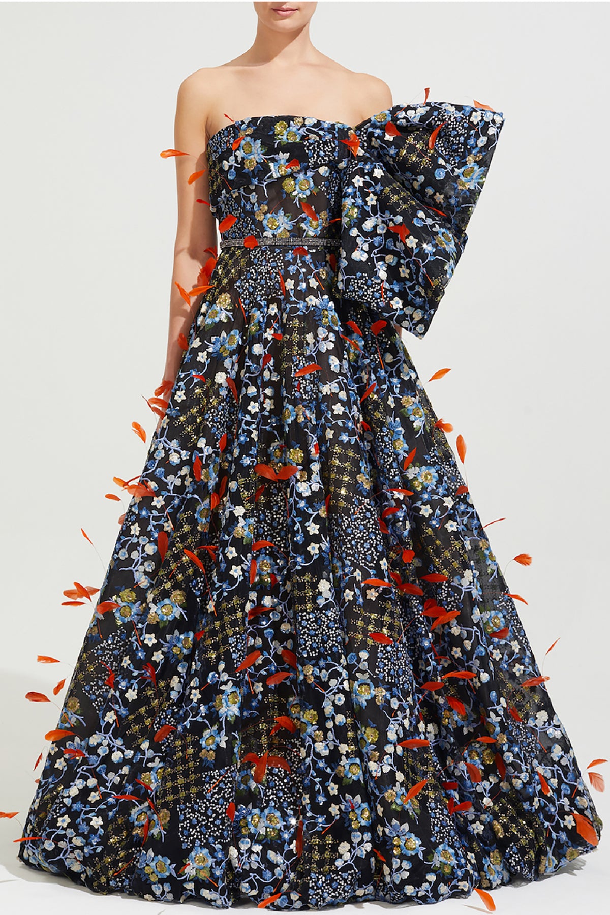 Multicolor strapless dress. Featuring an A-line silhouette long dress without slit.