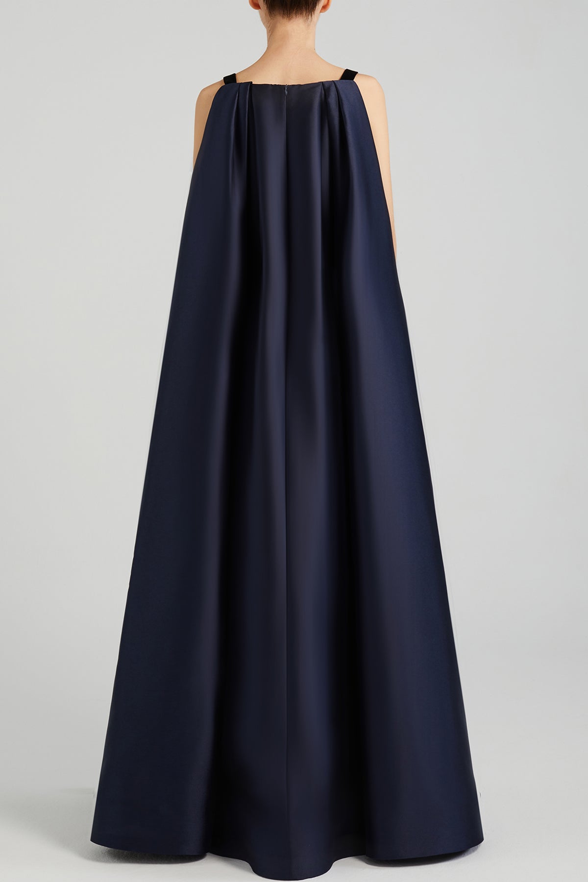 Navy one of our archival dress. Featuring a floor-grazing square neckline and a column silhouette accented velvet straps and a cape that brings the drama. Complemented with a mismatched crystal brooches adorn the side along the side slit.