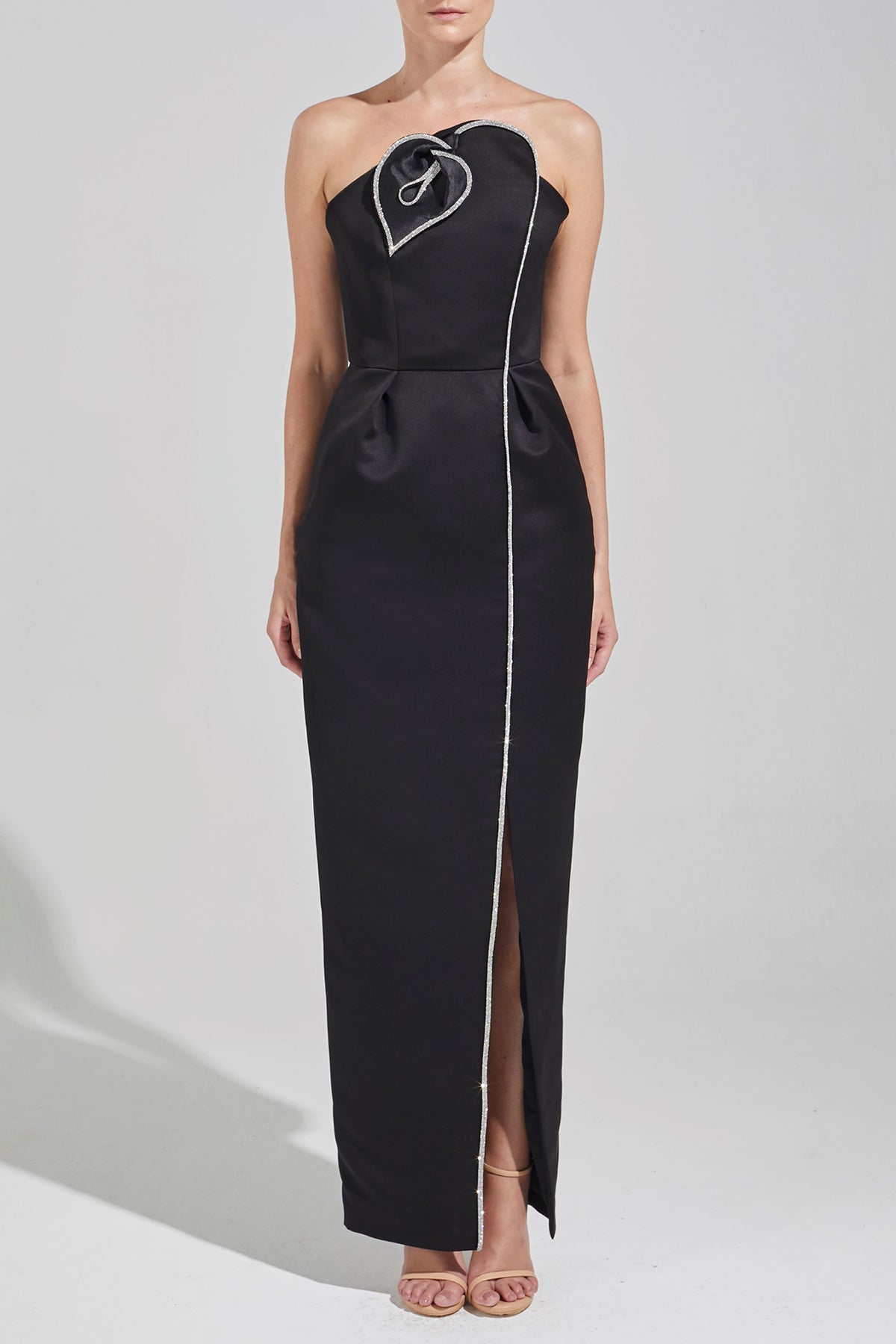 Black double-satin black dress. Featuring a focal point calla lily detail taffeta and embellished with a shiny crystal chain. Complemented with a top rounded silhouette that takes inspiration from the flower.