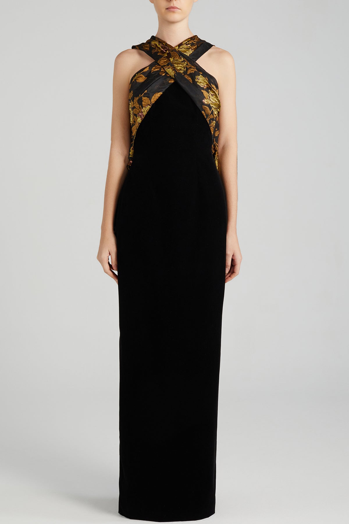Multicolor halter-neckline dress. Featuring first glance, but a turn to the back will reveal the intricately draped cocoon detail. Complemented with a fil-coupé balances out the velvet piece with a touch of softness.