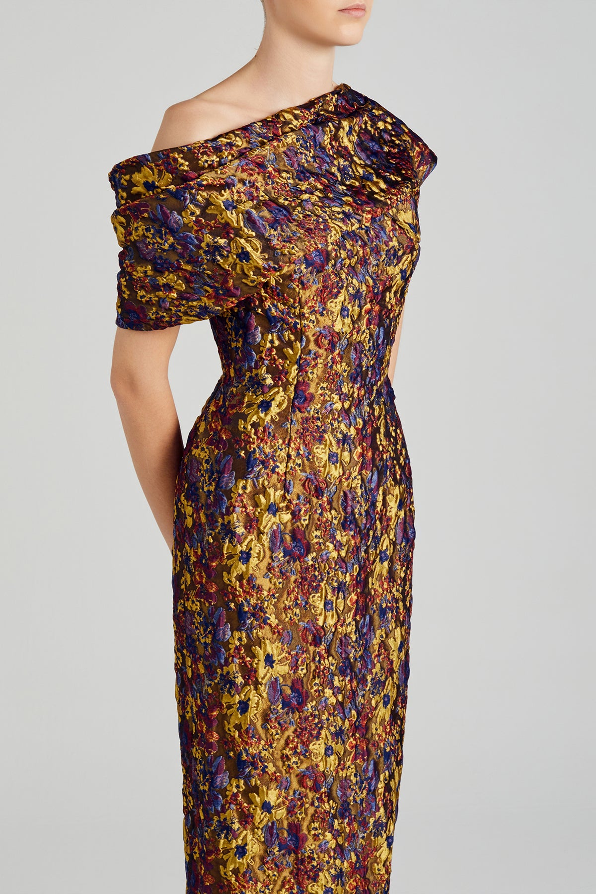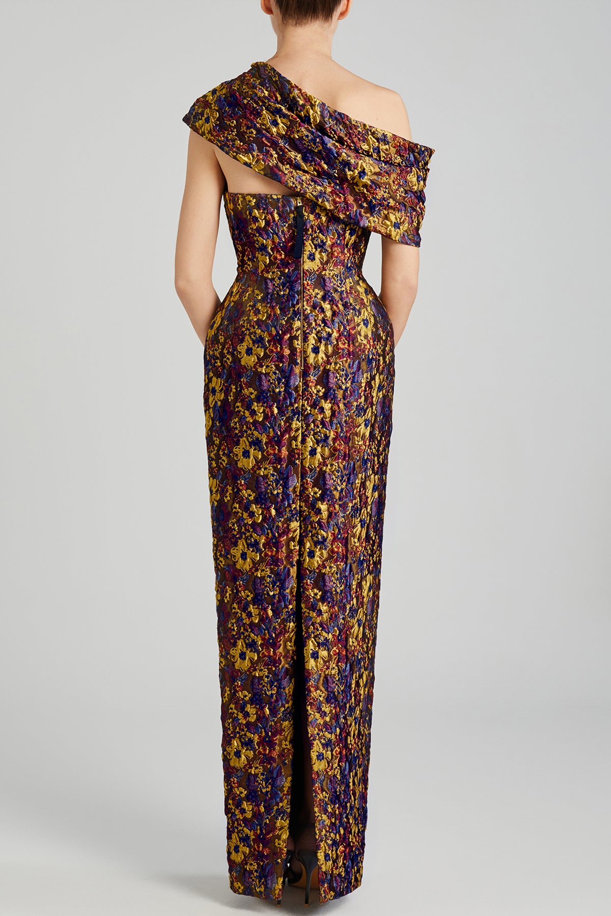 Multicolor floral brocade dress. Featuring draws inspiration from the intricate tapestry on the palace walls. Complemented with a textured piece and an asymmetrical drape that overlays the décolletage.