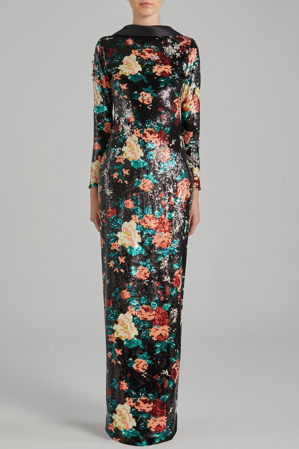 Multicolor floral sequin dress. Featuring a long-sleeve with pearl and crystal embellishments. Complemented with a finished zip closure and a slit at the back.