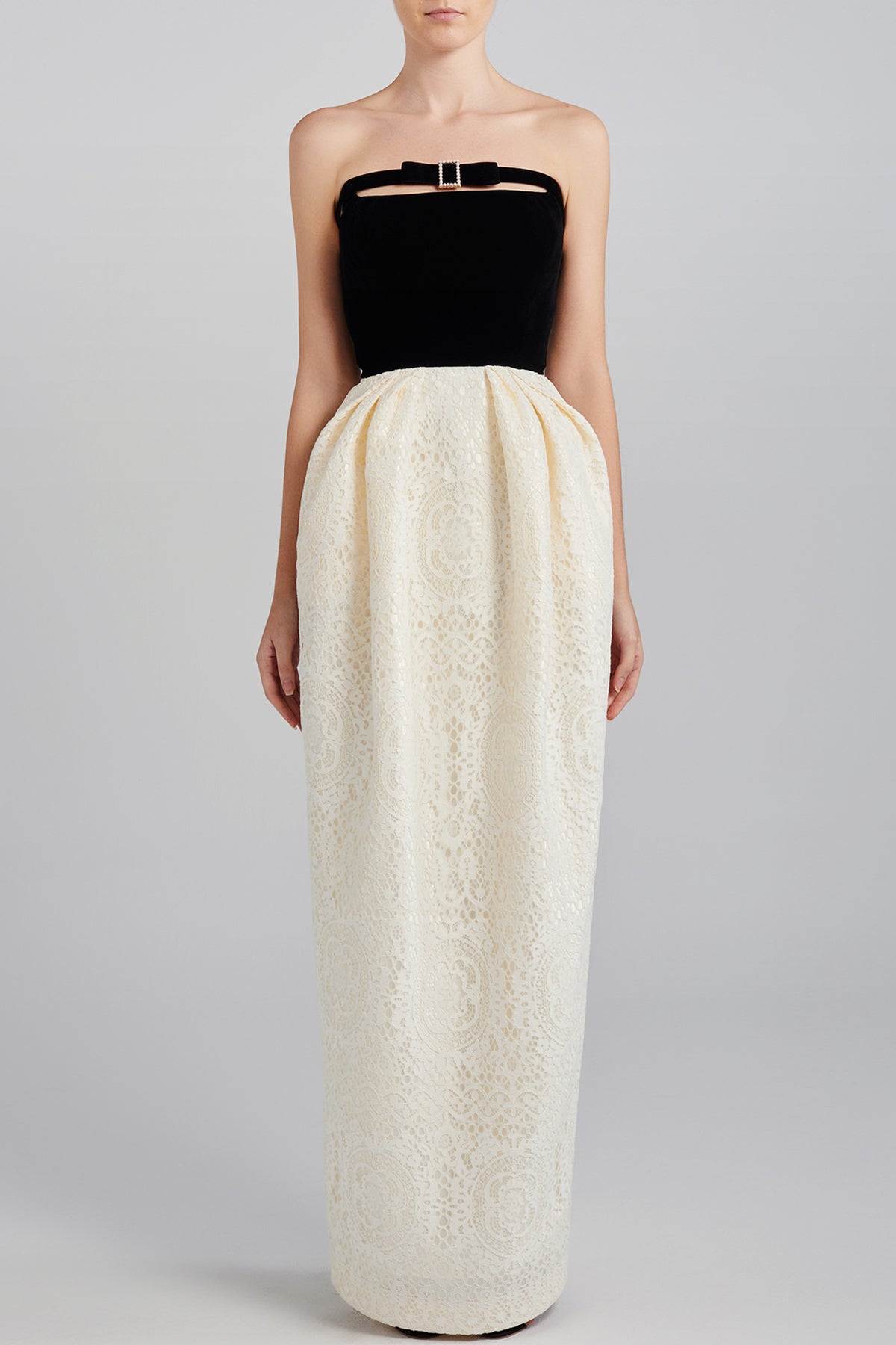 Black and ivory lace over taffeta dress. Featuring an archival silhouette skirt is highlighted by the alluring cocoon shape contrasted with a fitted velvet strapless top. Complemented with a pearl bow buckle across the décolletage.