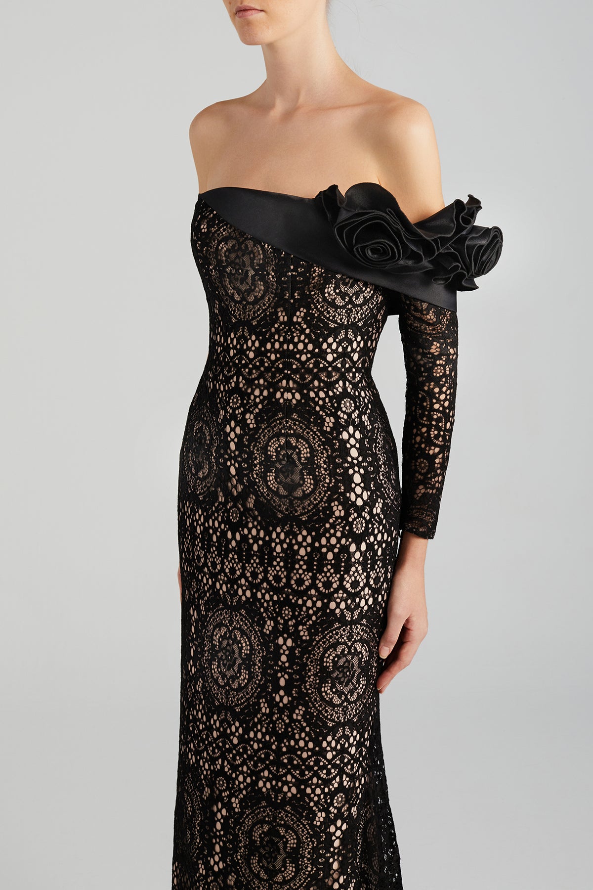 Black lace off-the-shoulder mermaid dress. Featuring a floral appliqué in taffeta with a single long sleeve lends an asymmetrical. Complemented with a fully lined piece secured with a back zip.